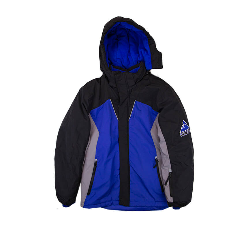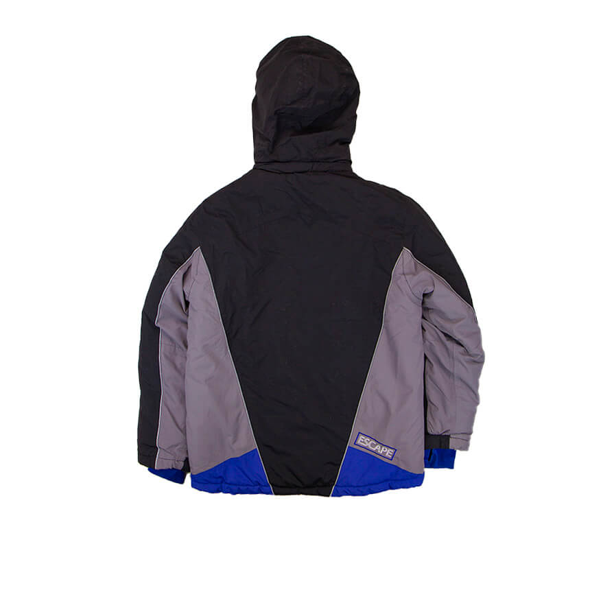 Куртка с капюшоном черного цвета с сине-серыми геометричными вставками.