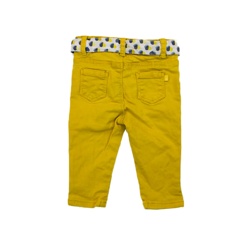 Джинсы ярко желтого цвета с цветным поясом.
