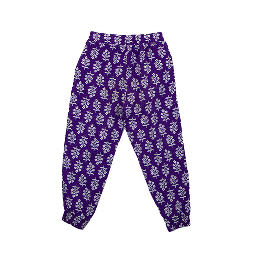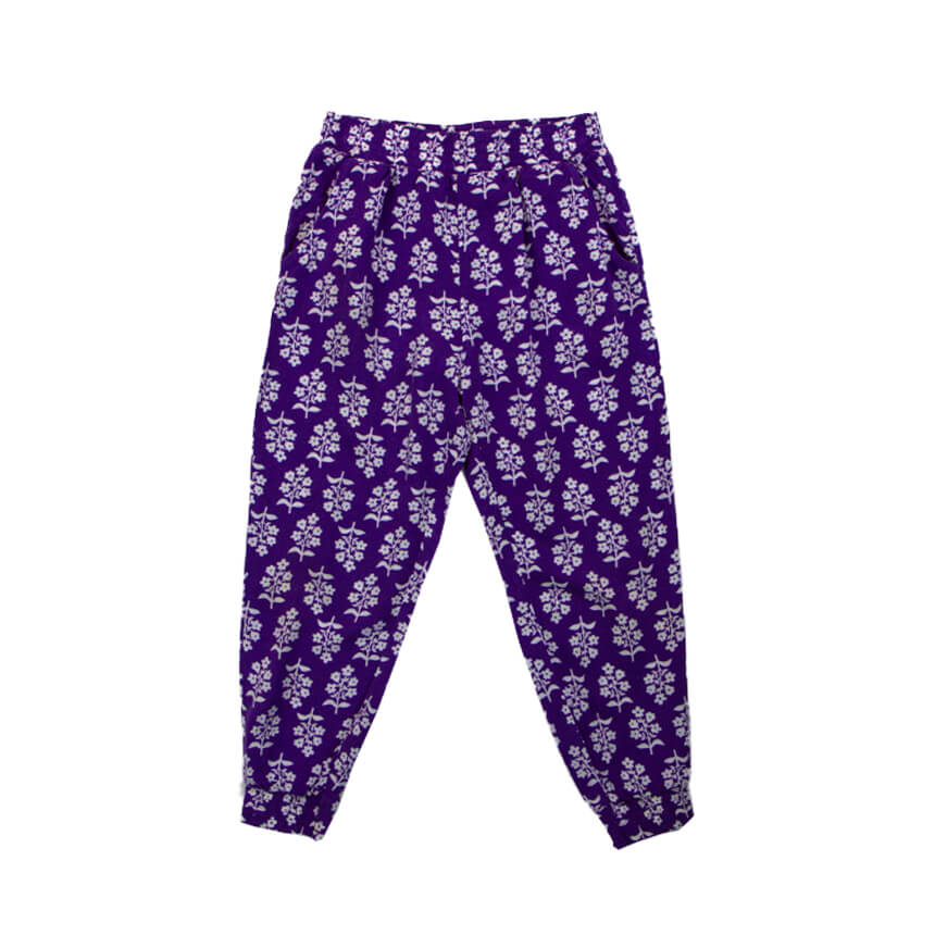 Леггинсы цветные фиолетового цвета с белым принтом.