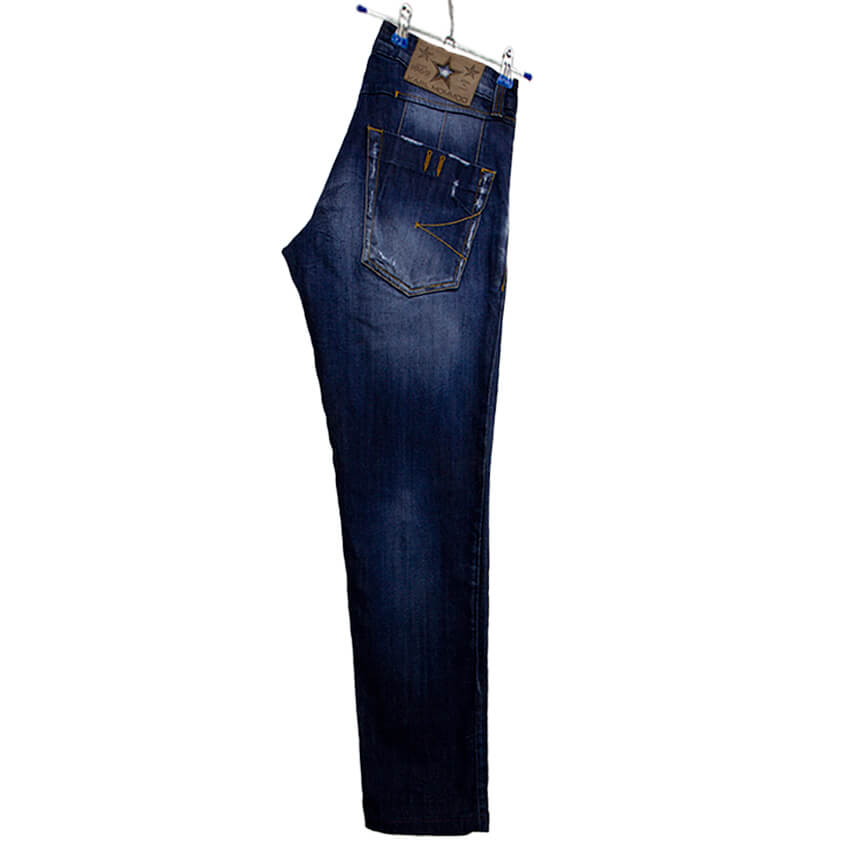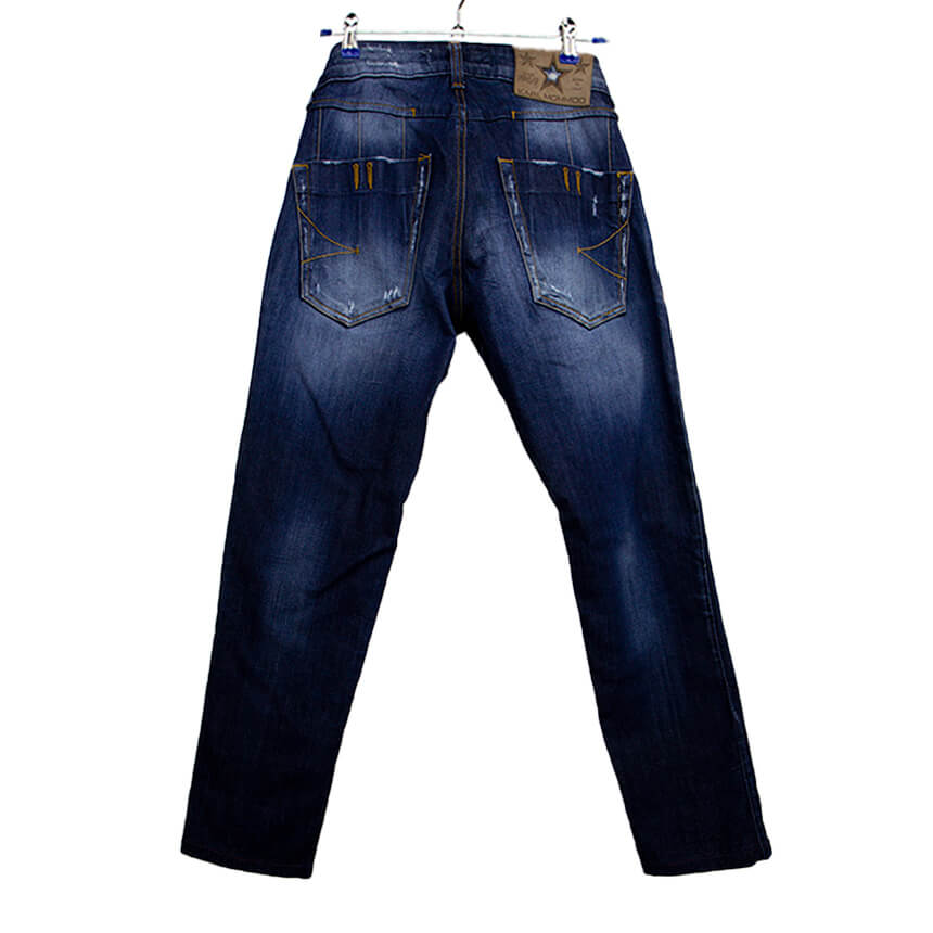 Джинсы синего цвета свободного кроя. Жатые в области бедер с декоративными "дырками".