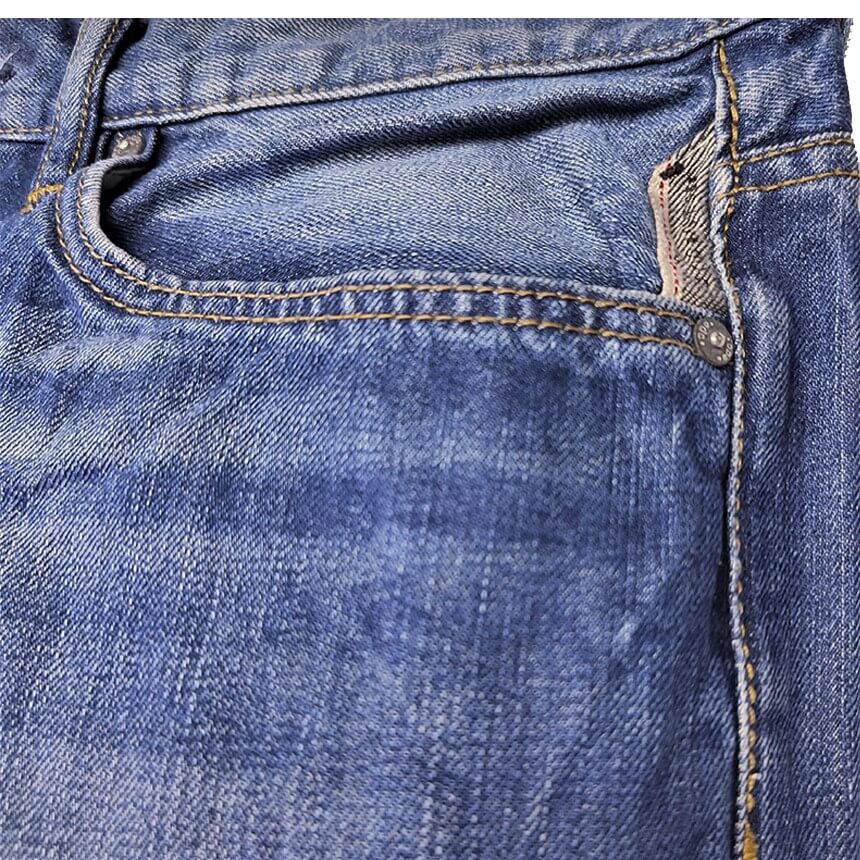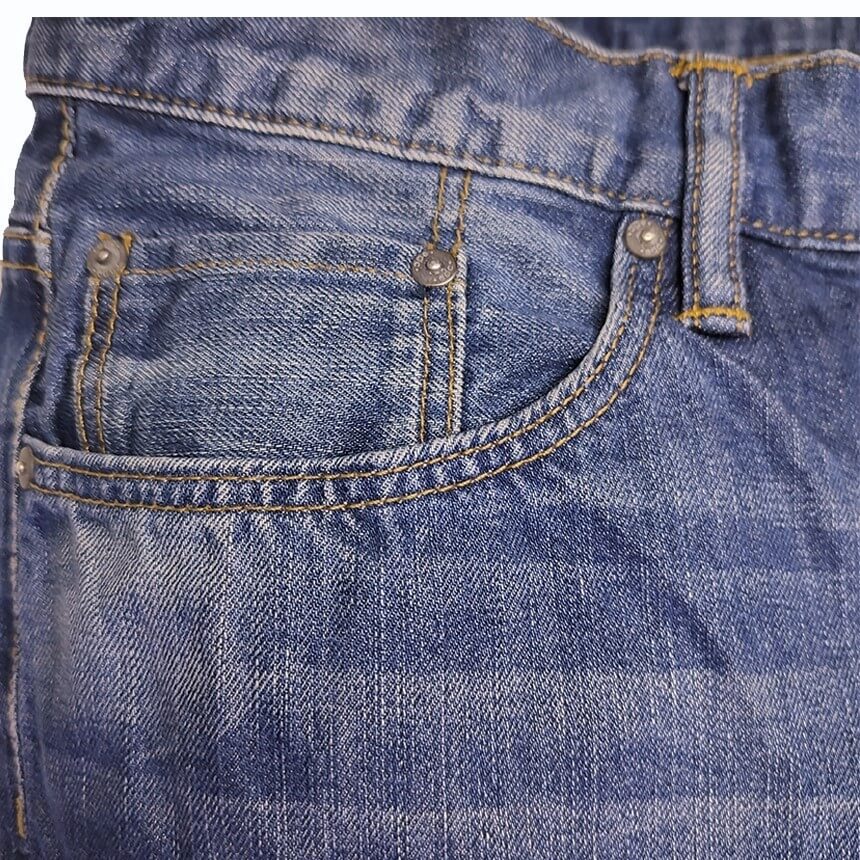 5 карманов: 3 спереди и 2 сзади, защипы, декоративная тесьма на карманах.
