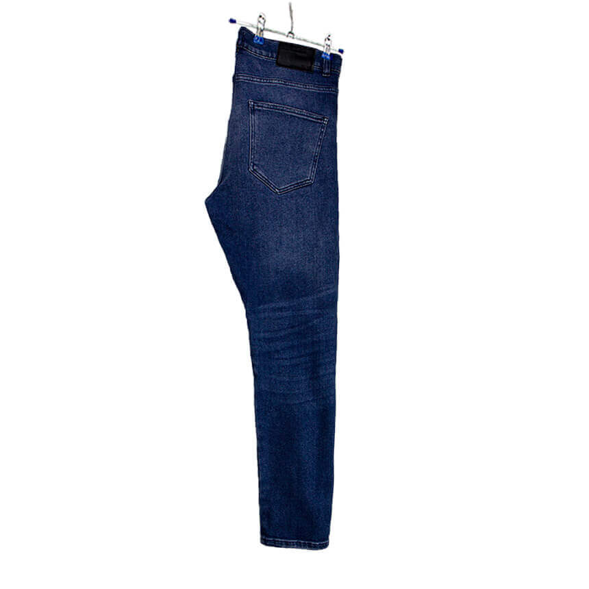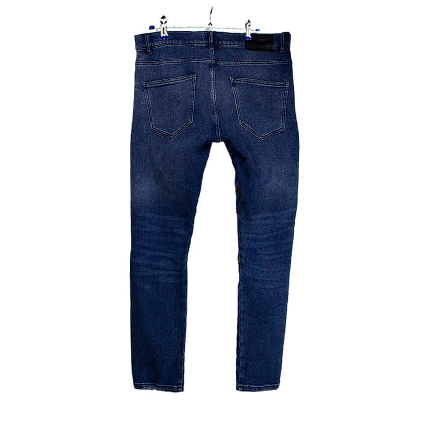 Джинсы зауженные синего цвета с потертостями.