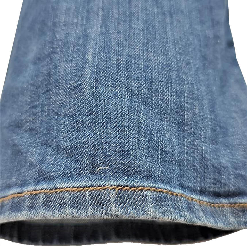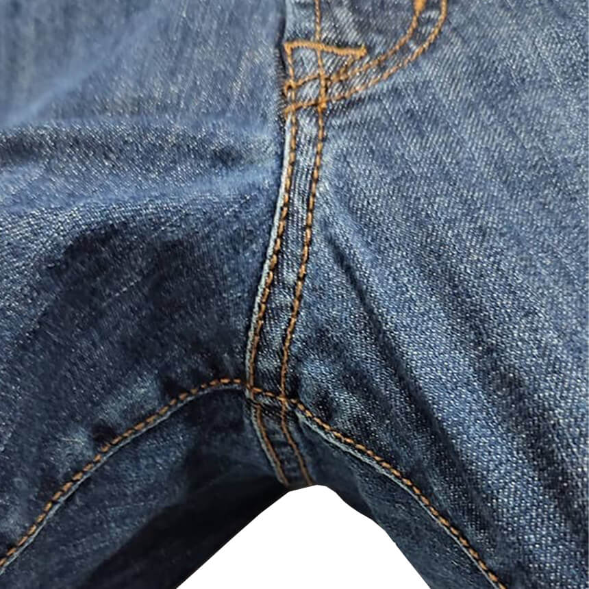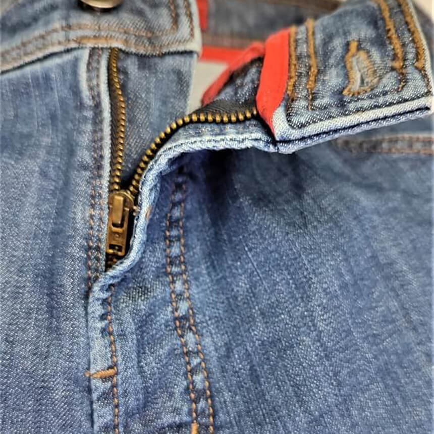 Декорированы красной подкладкой на карманах, красной отделочной тесьмой с изнанки, фирменным флажком на гульфике.