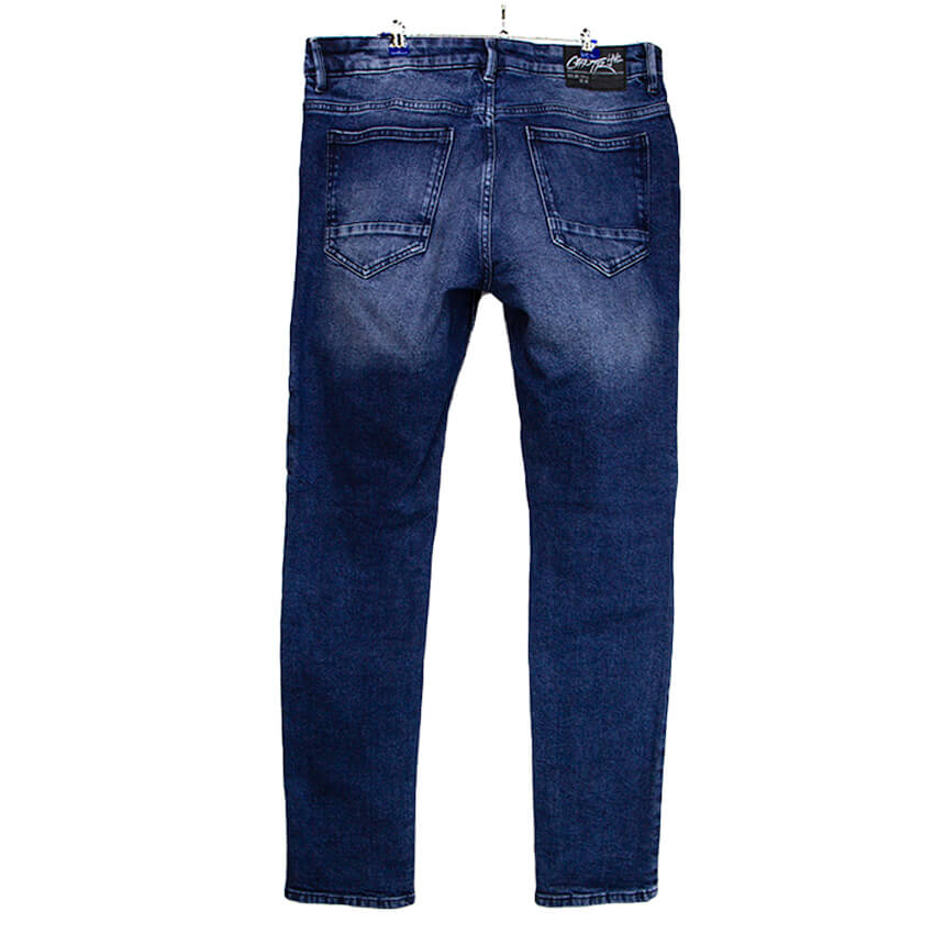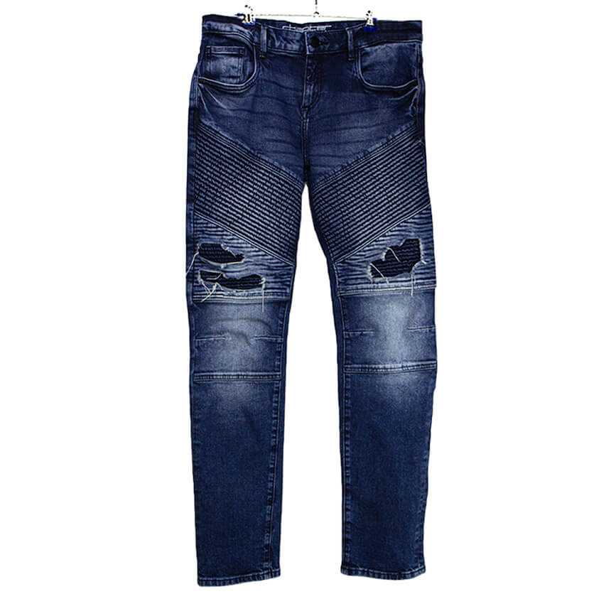 Джинсы синего цвета с потертостями, стрейтч, зауженные.
