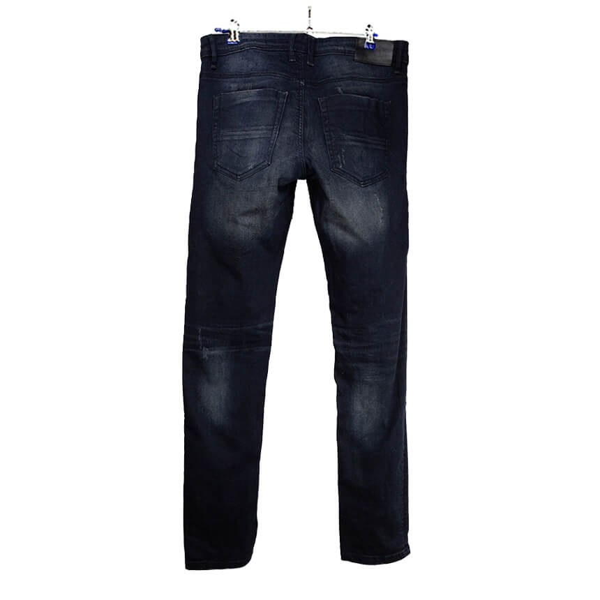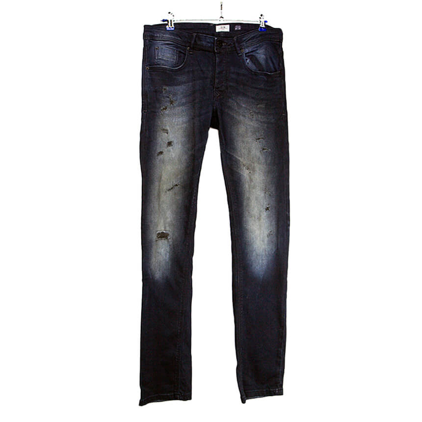 Джинсы темно-синего цвета с потертостями, стрейтч, прямые.