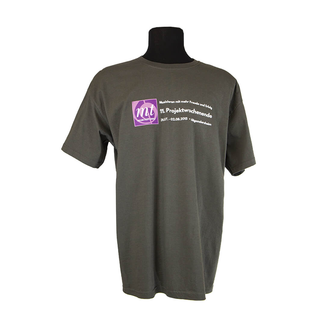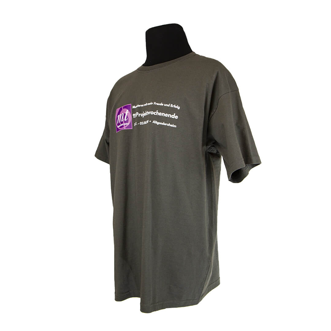 Майка спокойного серого цвета с белым текстом и ярким принтом. Бесшовная.