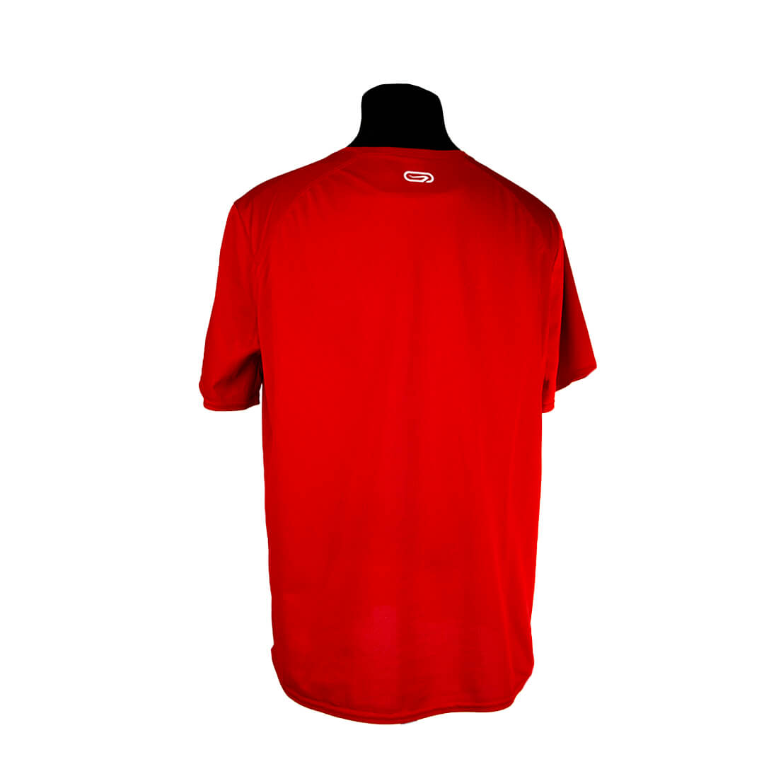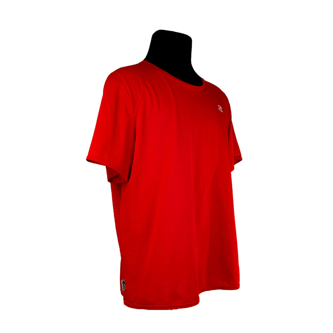 Майка красного цвета с белым логотипом на груди и на спине, светоотражающий лейбл снизу.