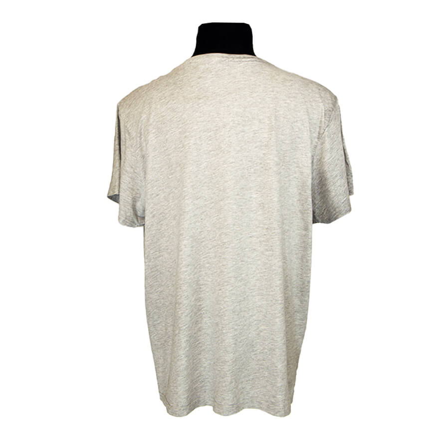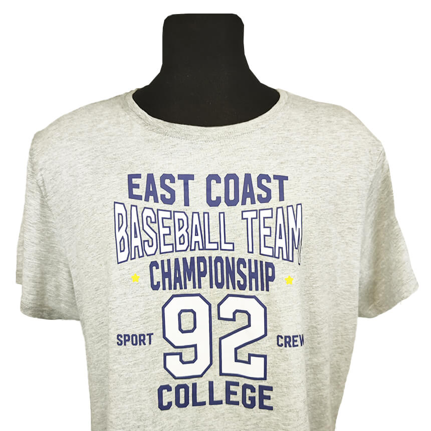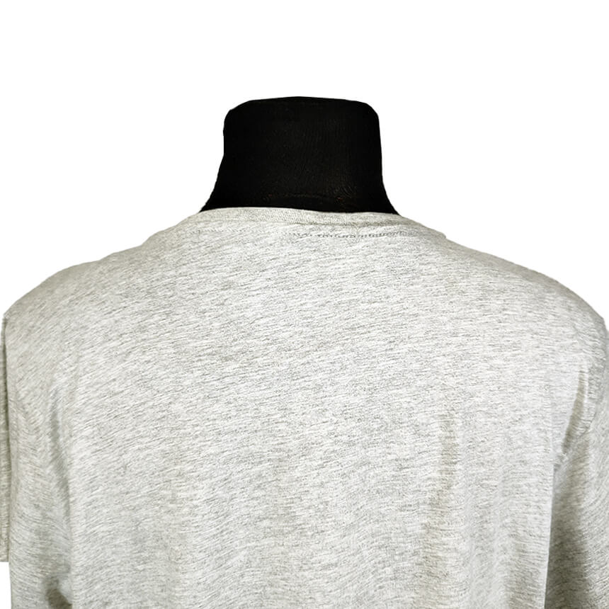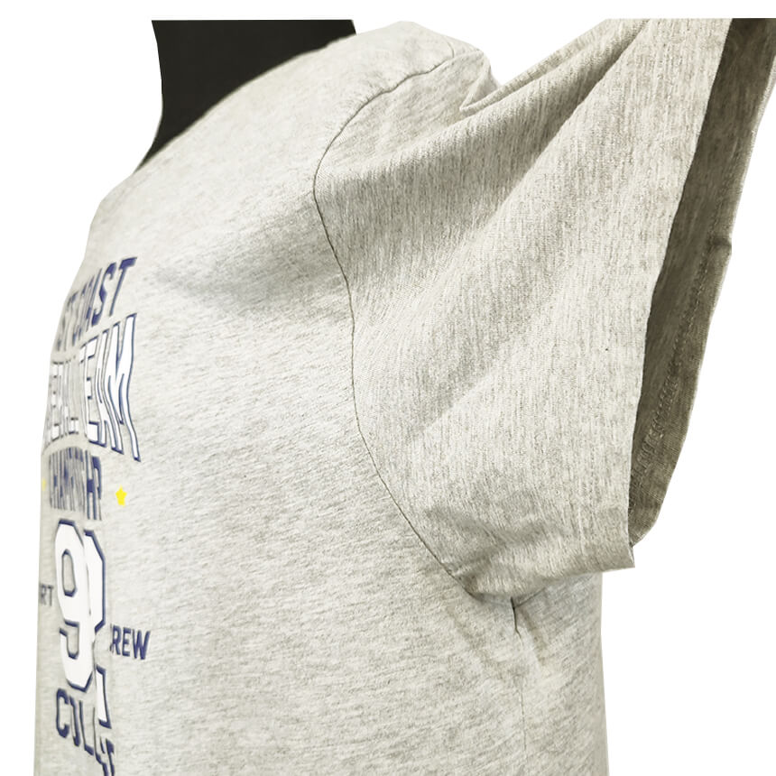 Майка сдержанного серого цвета с ярким принтом.