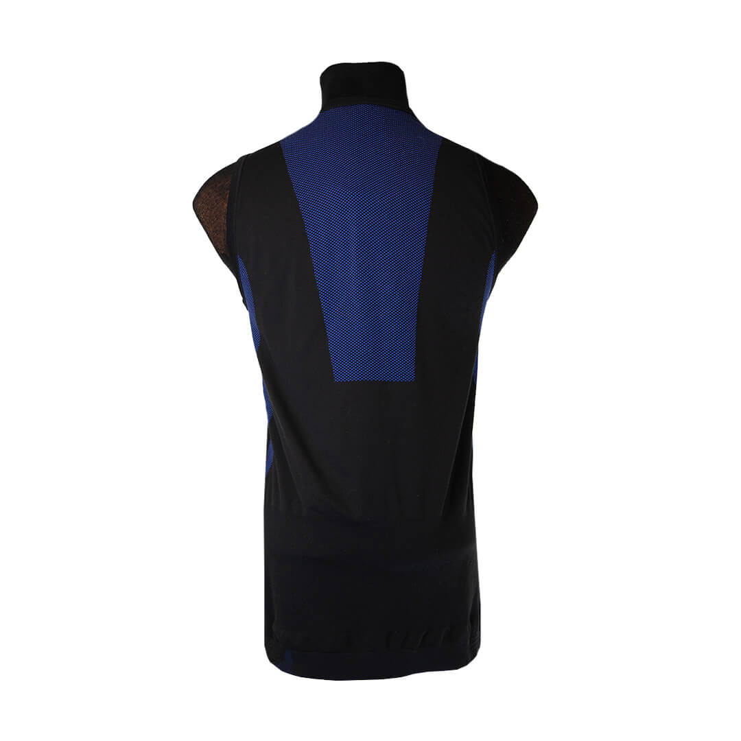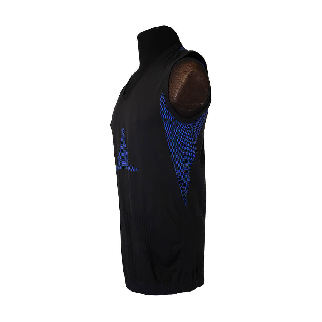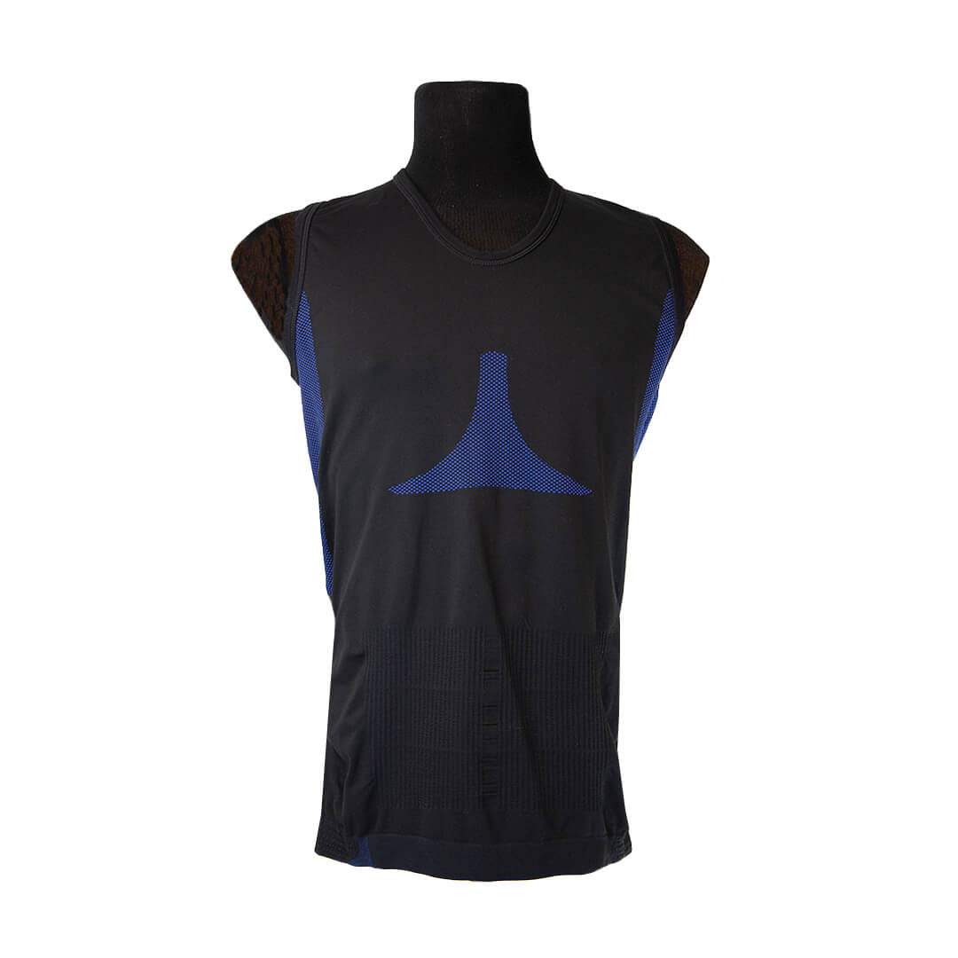 Майка черного цвета с прорезиненной голубыми дышащими вставками. Логотип спереди.