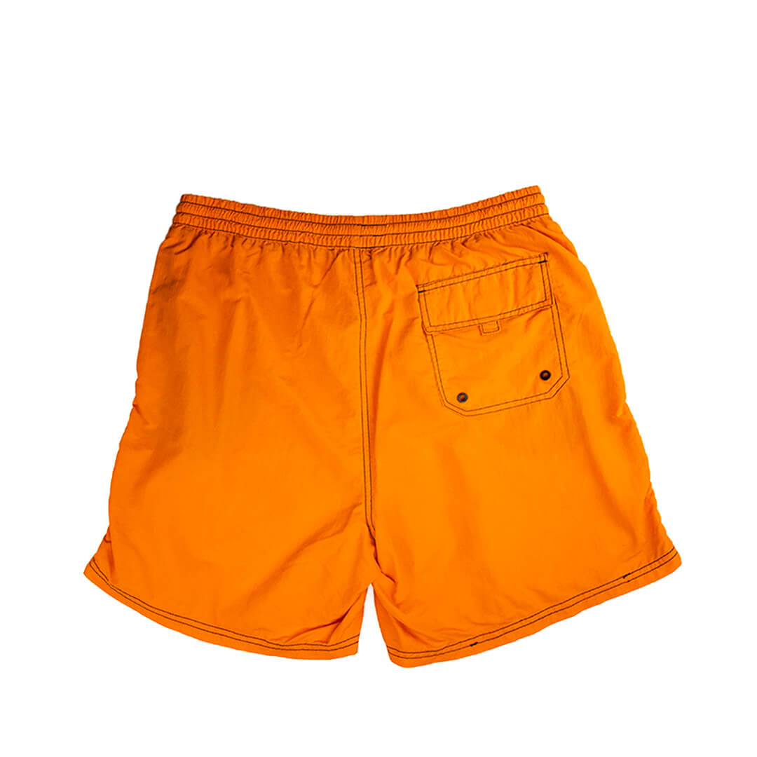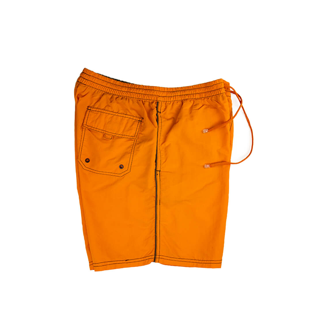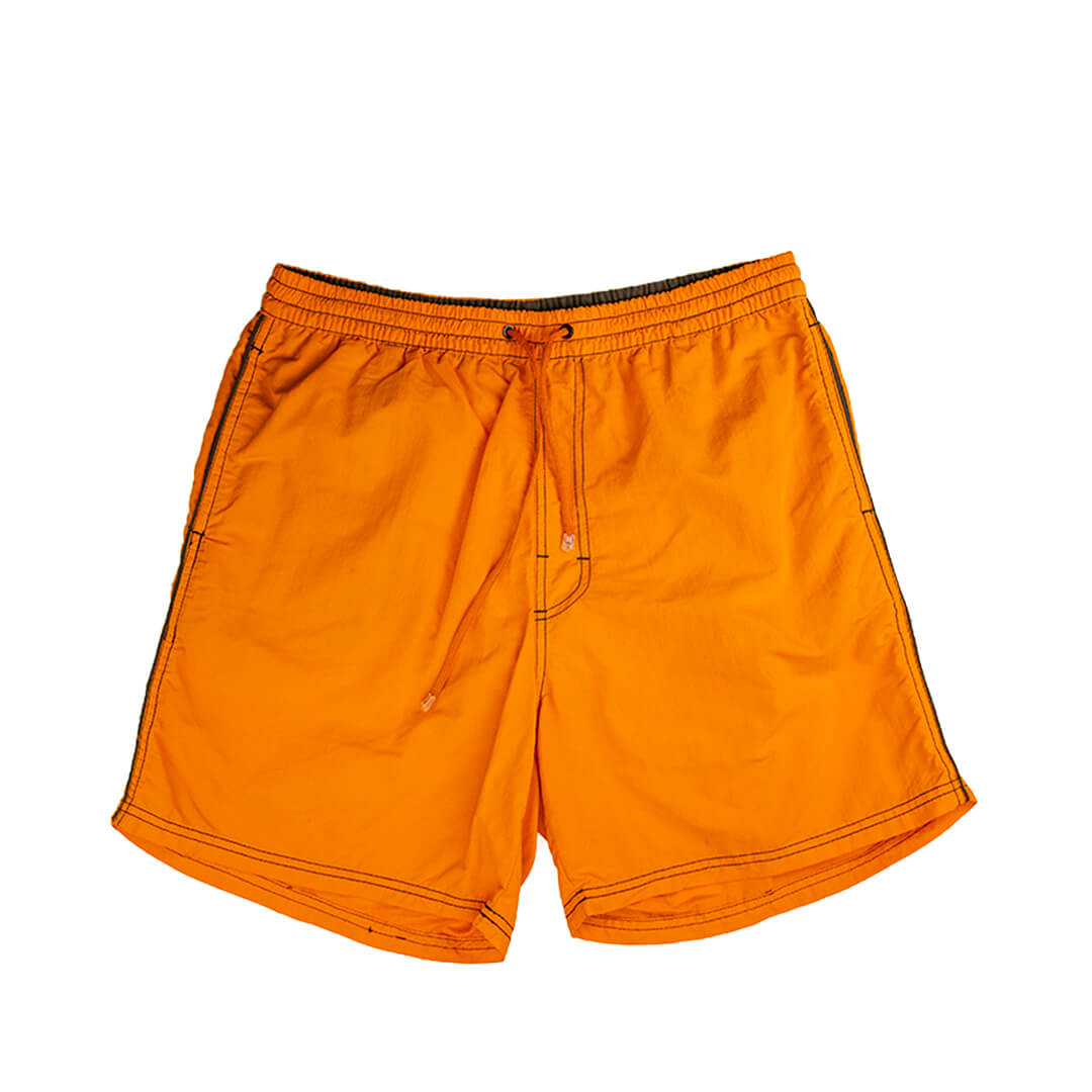 Шорты яркого оранжевого цвета с черной отстрочкой, сеточка-трусы.