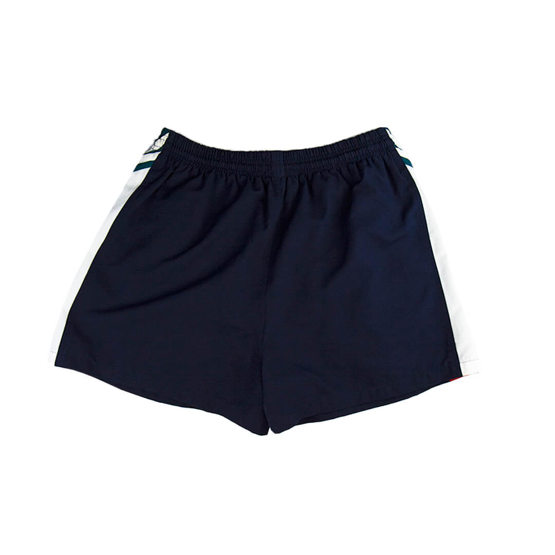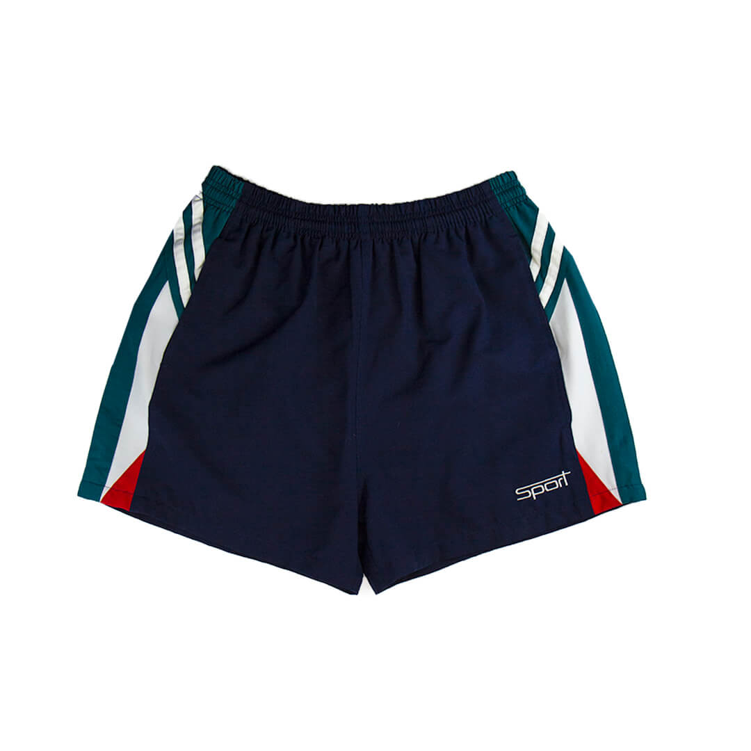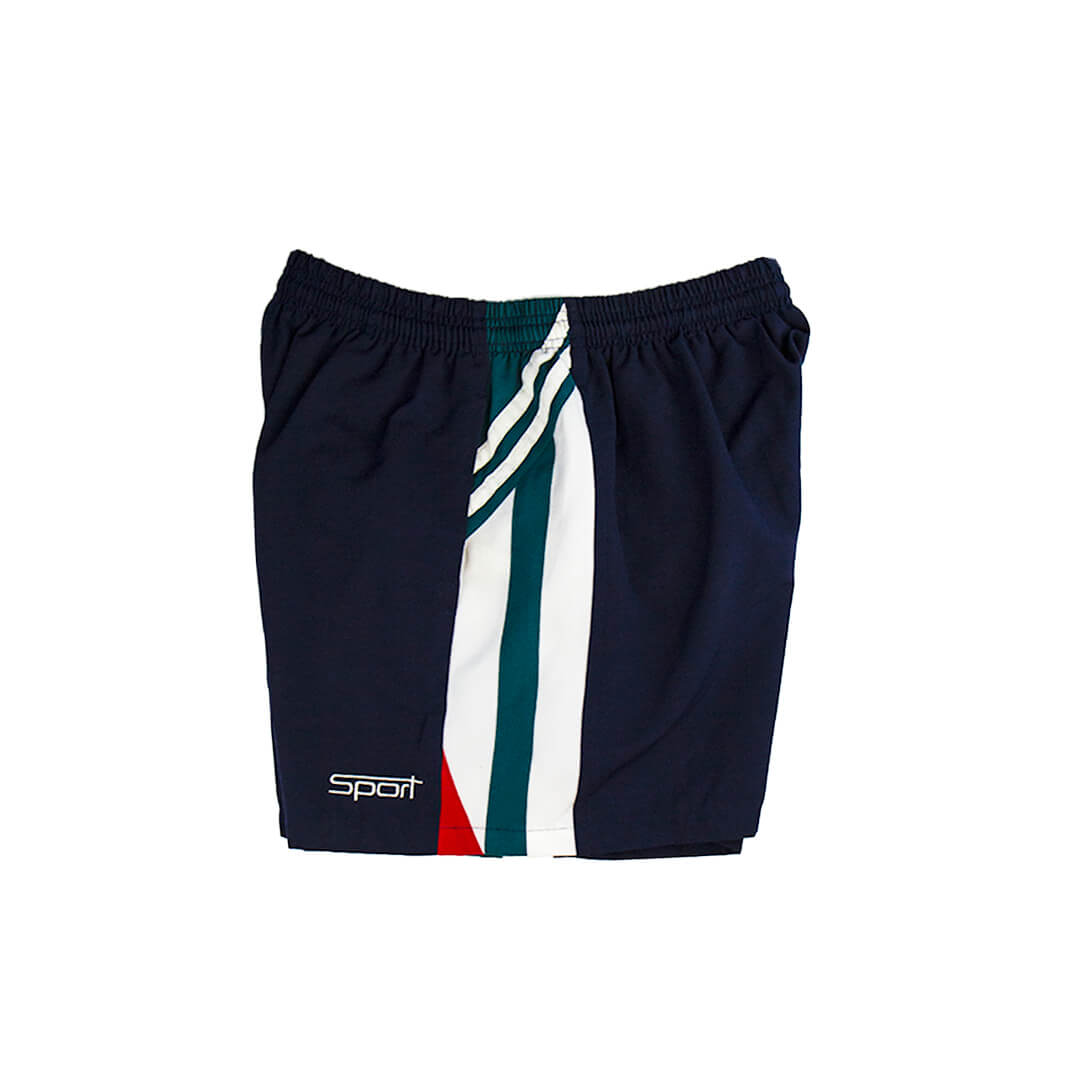 Шорты темно-синего цвета с бело-зелено-красной отделкой. Пояс резинка, подкладка - трусы.