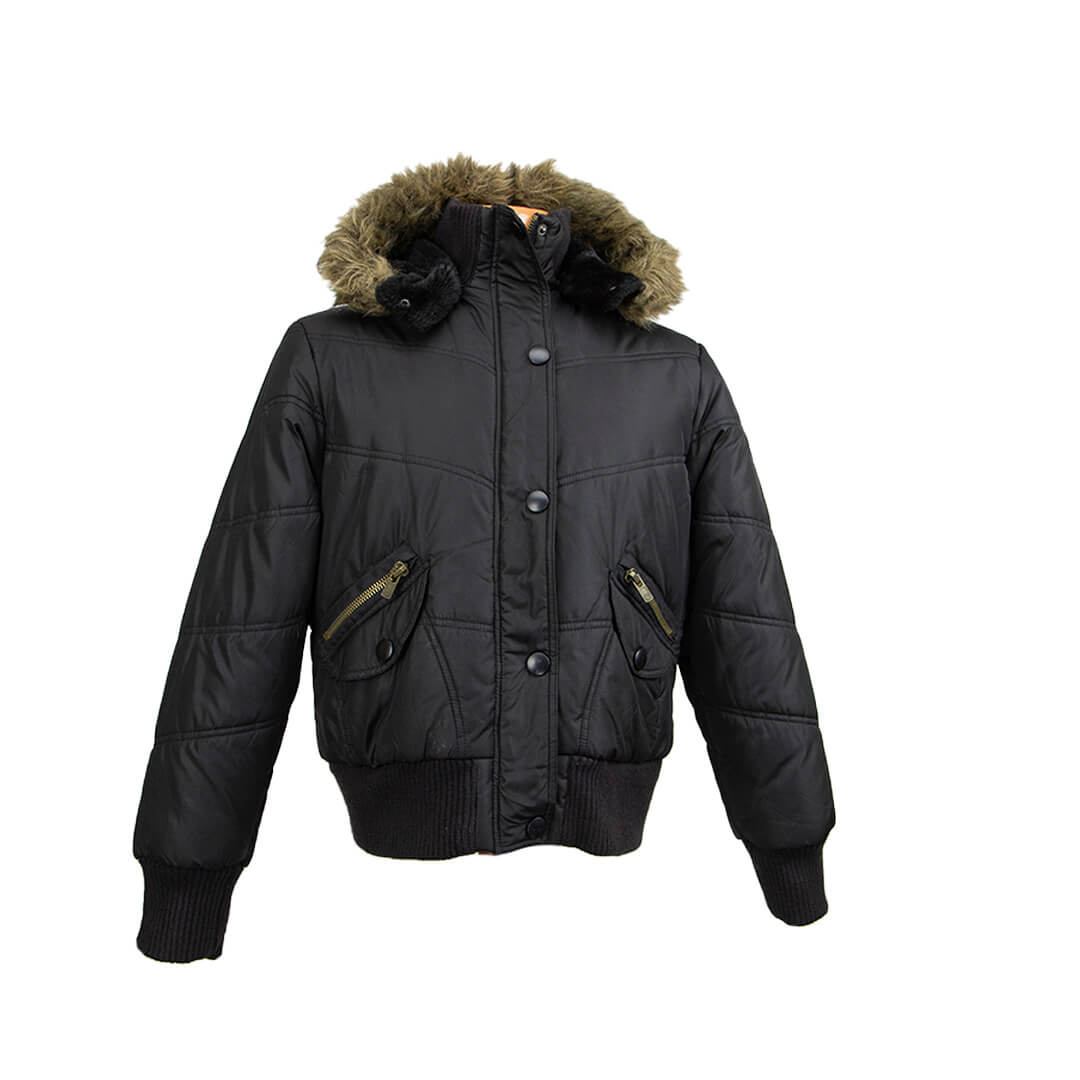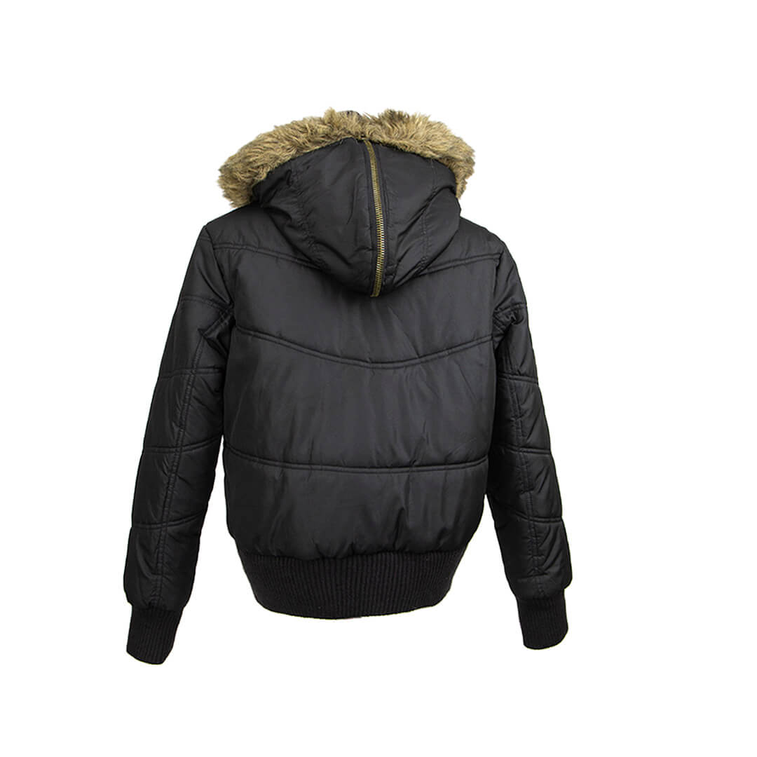 Куртка стеганная черного цвета с капюшоном и опушкой.