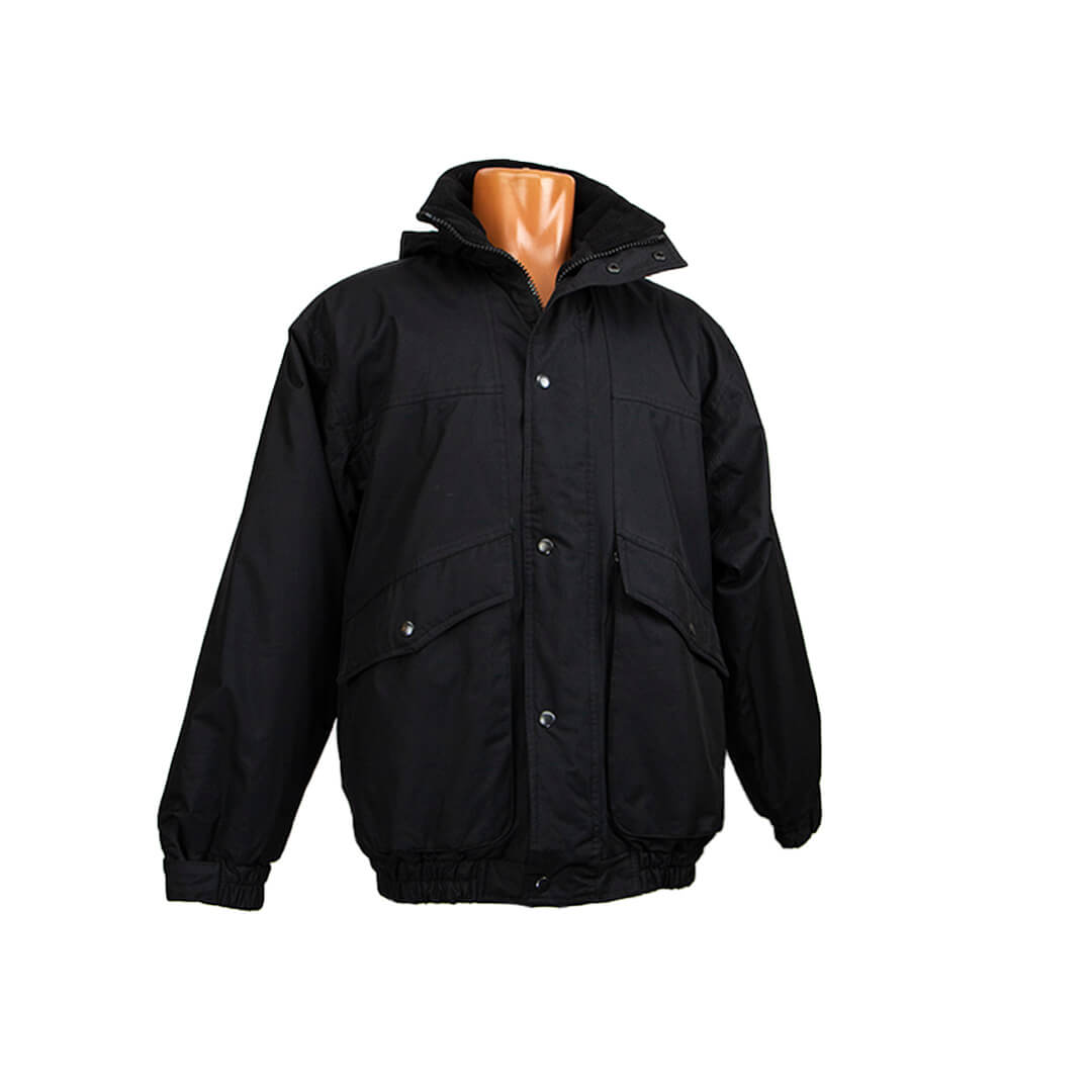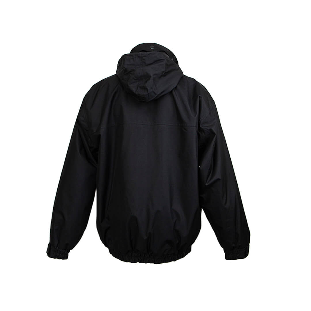Куртка черного цвета с капюшоном с пропиткой от дождя. Капюшон прячется в воротник, регулируется по объему.