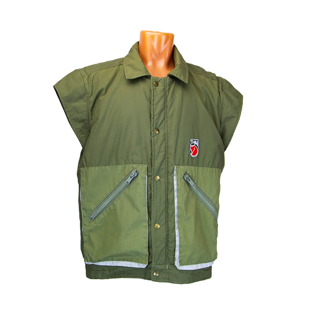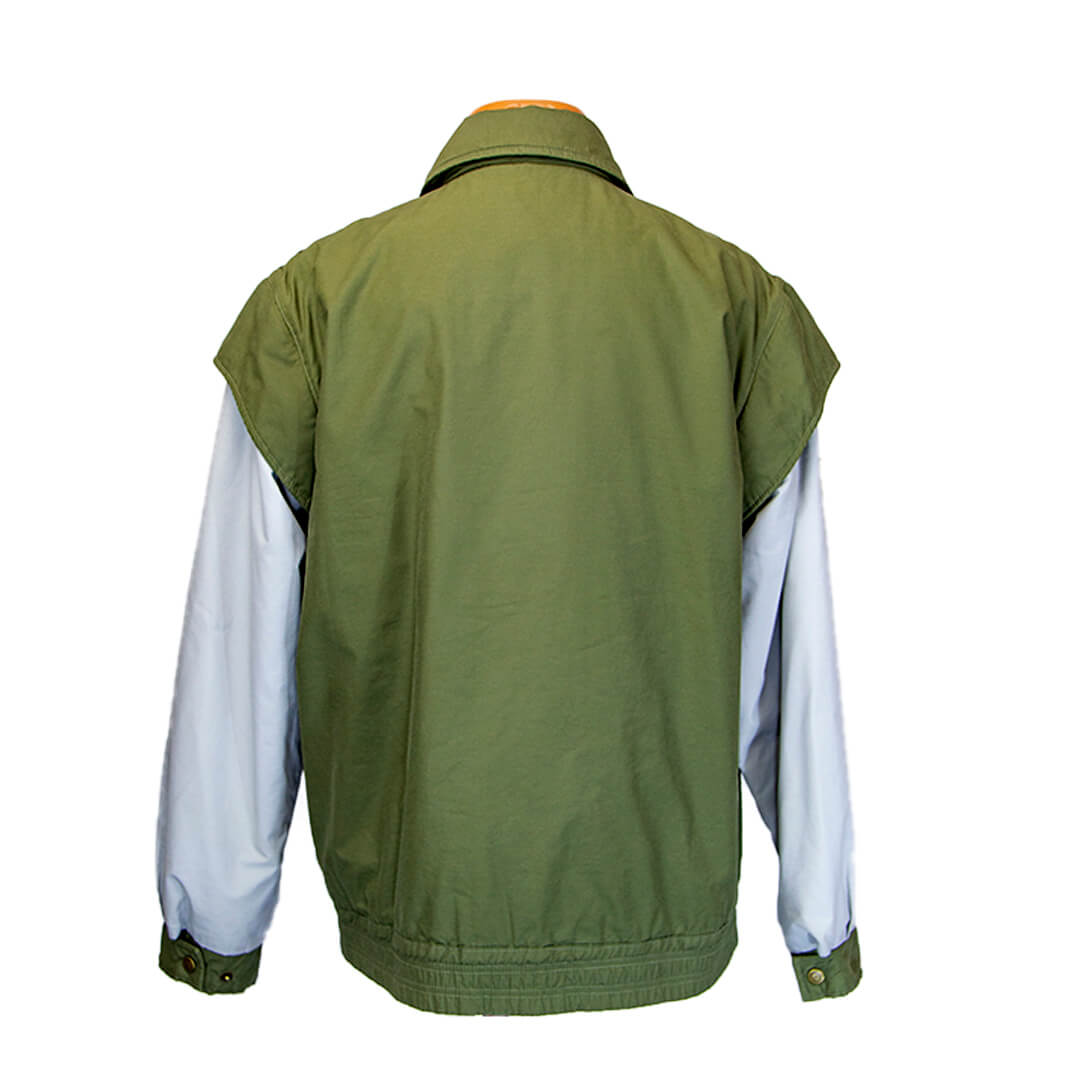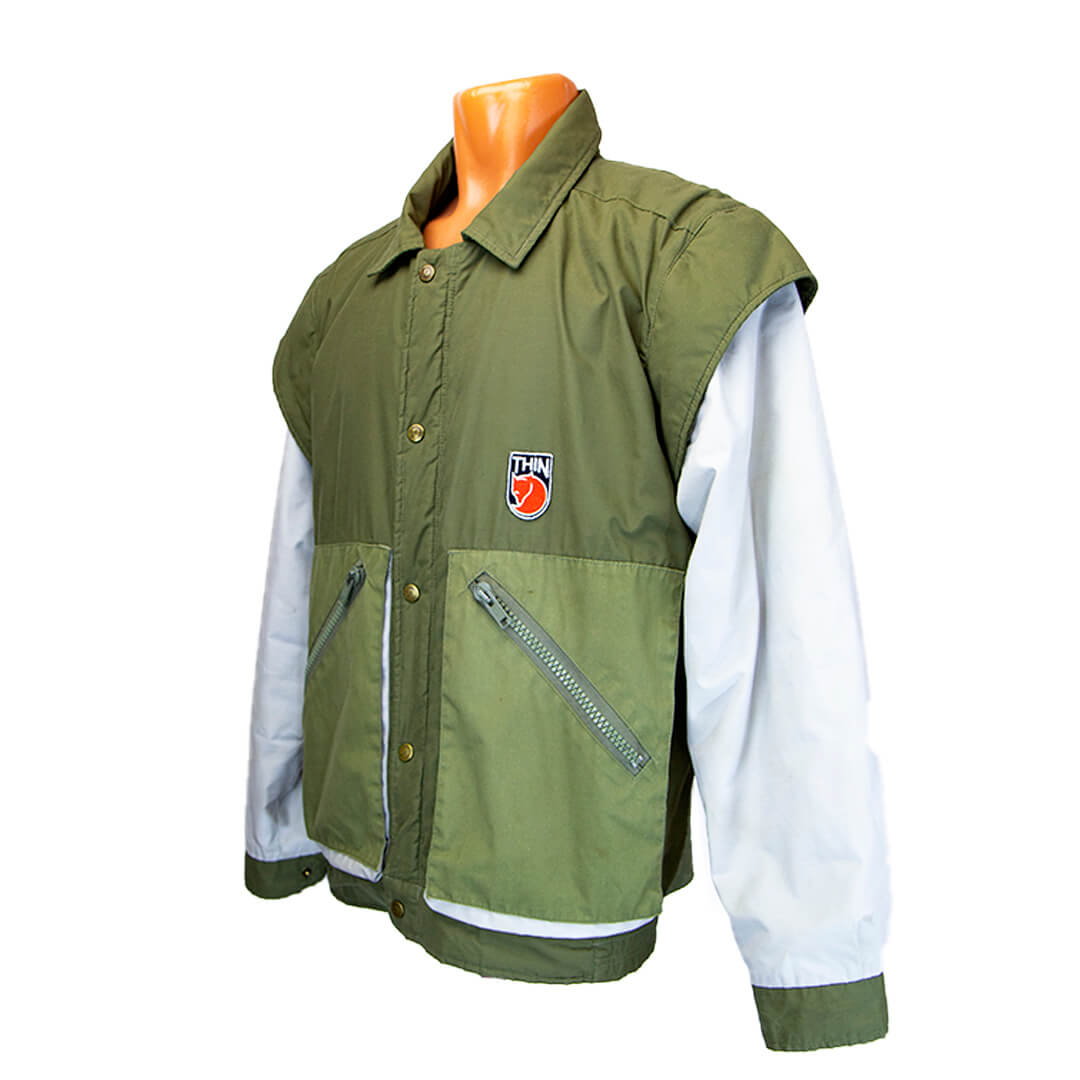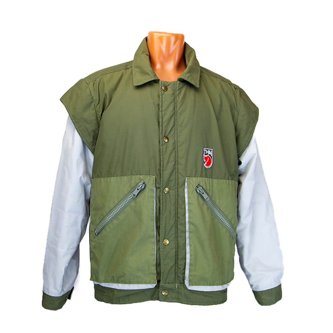 Парка зеленого цвета с серыми рукавами. Манжеты на рукавах. Рукава отстегиваются и можно носить как жилет.