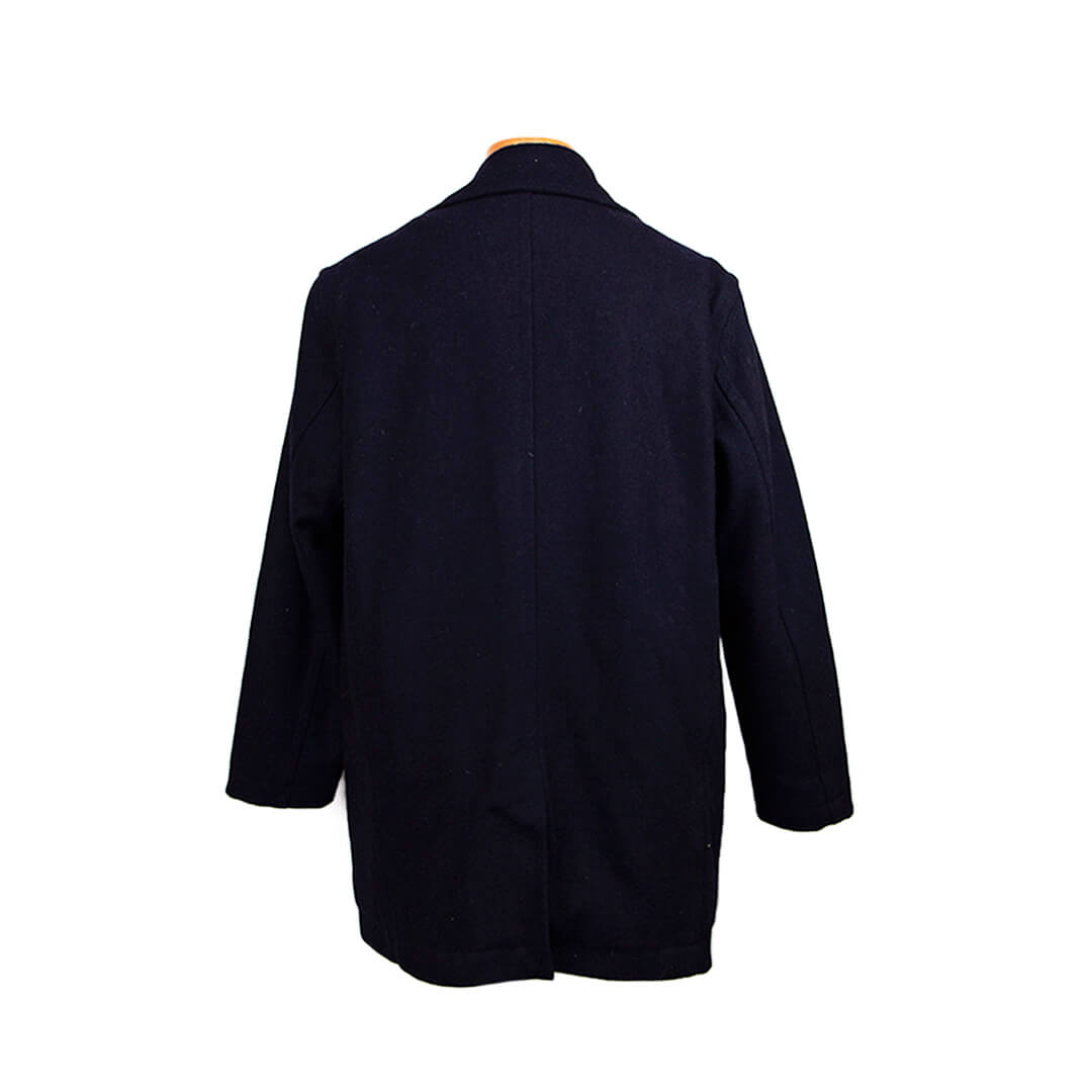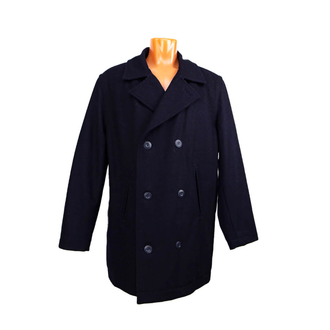 Пальто благородного темно-синего цвета с глубоким запахом.