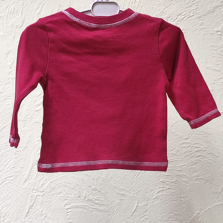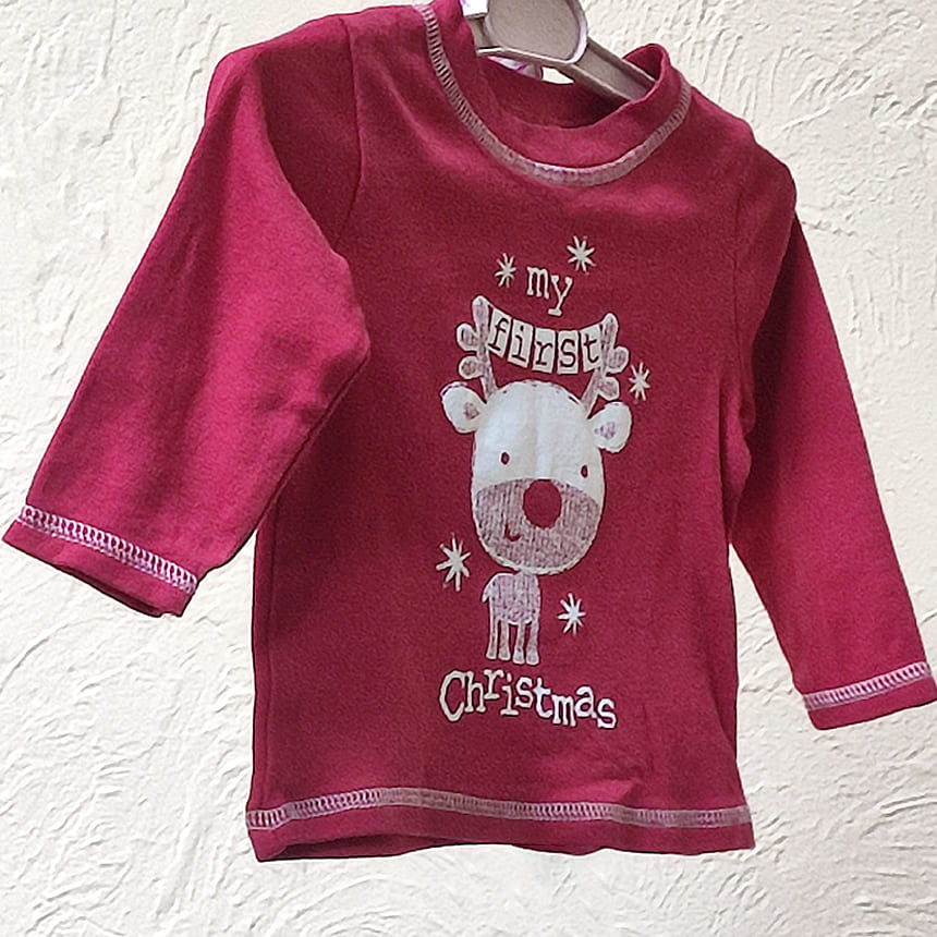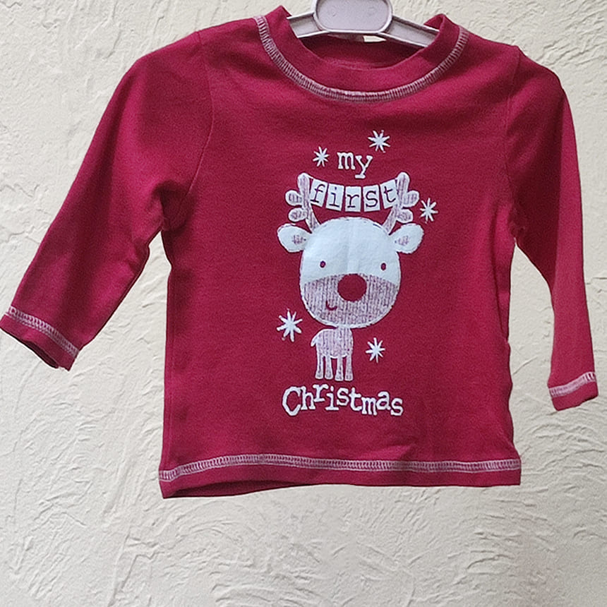 Футболка с длинным рукавом красного цвета с белым оленем и тематической надписью My ferst Christmas.