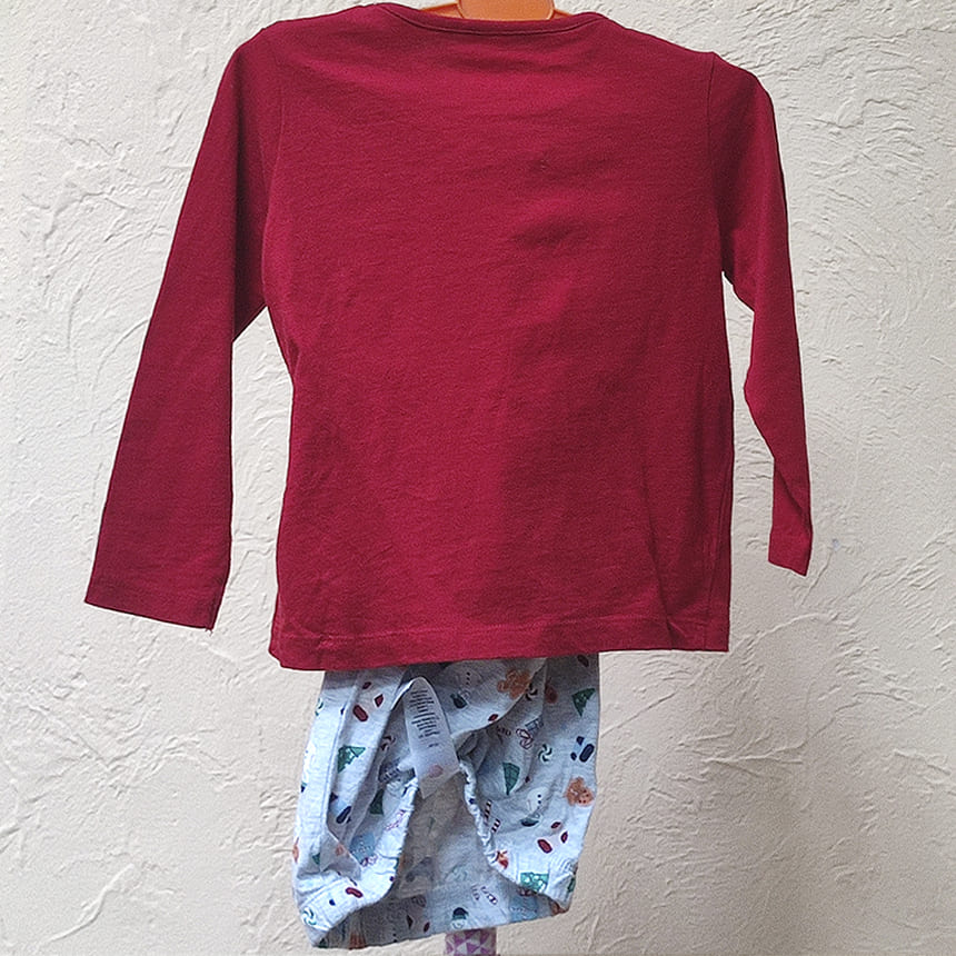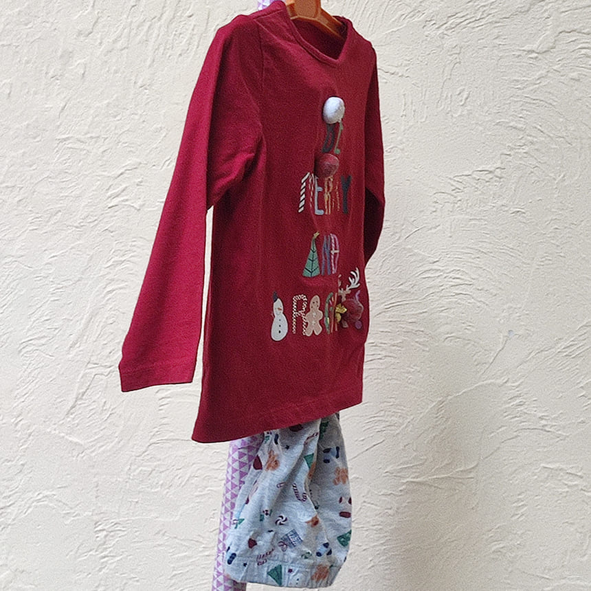Футболка красного цвета с длинным рукавом с помпонами и новогодними надписями. Штанишки серого цвета с тематическими рисунками на манжетах.