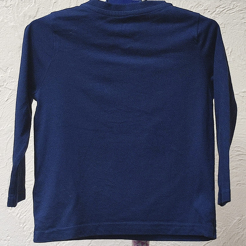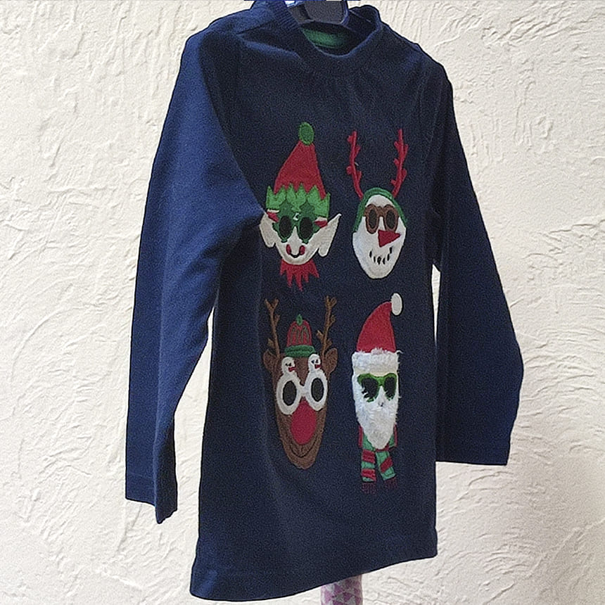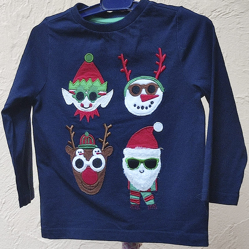 Футболка синего цвета с длинным рукавом и с 4 веселыми новогодними рисунками.