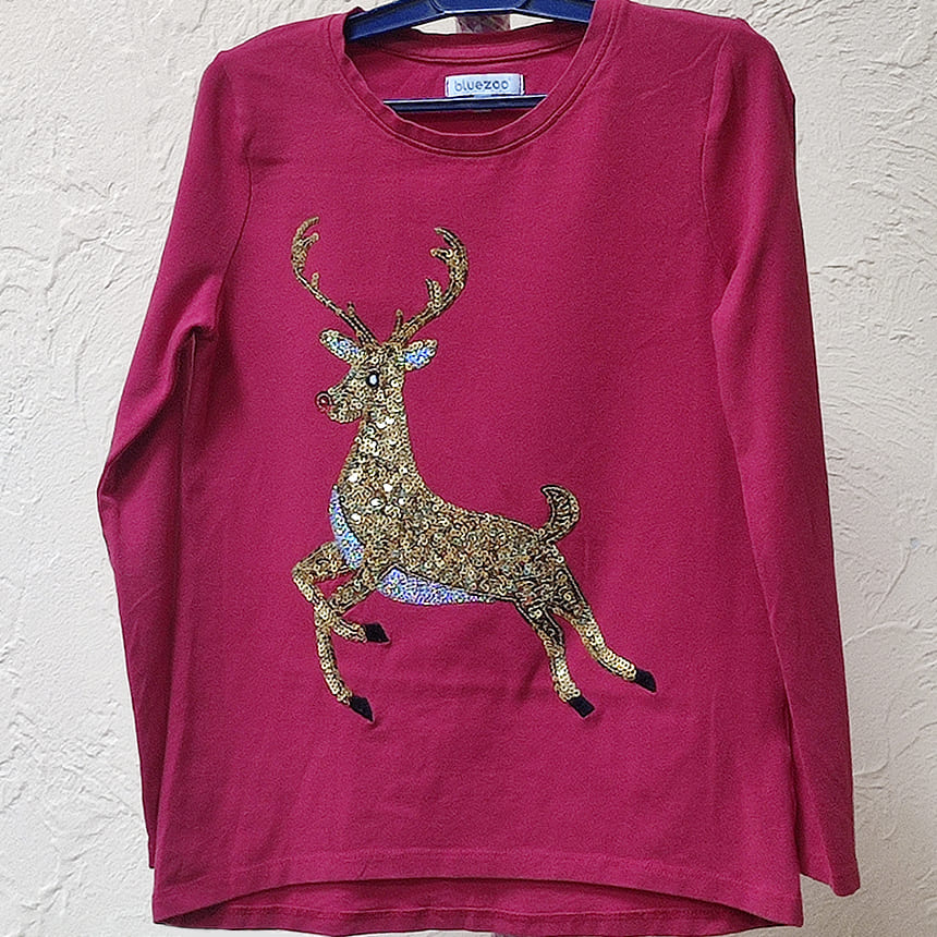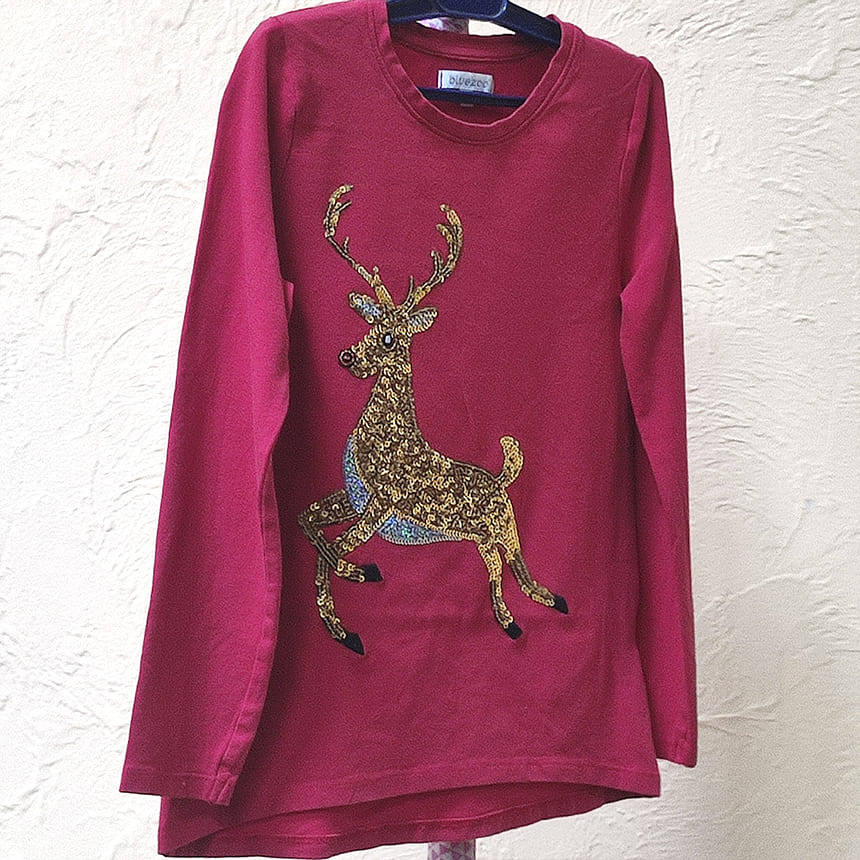 Футболка с длинным рукавом красного цвета с блестящим оленем в пайтетках.