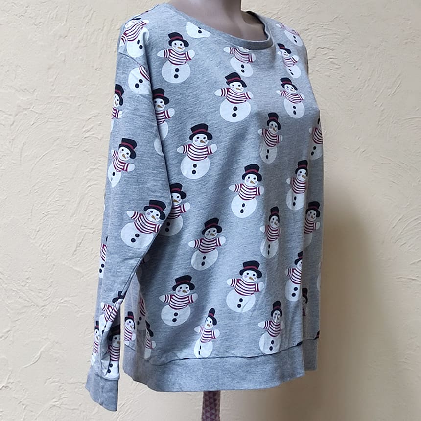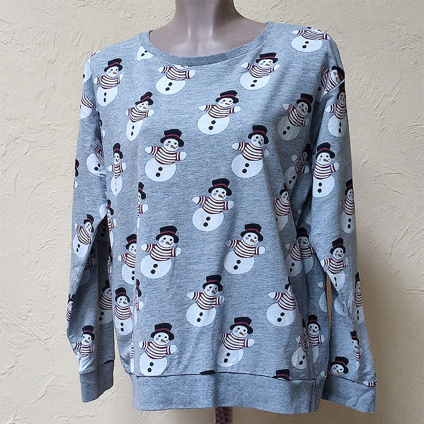Радостный свитшот светло-серого цвета с веселыми снеговиками.