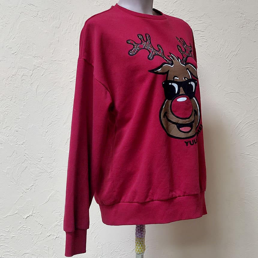Уютный свитшот красного цвета с рождественским оленем и тематической надписью.