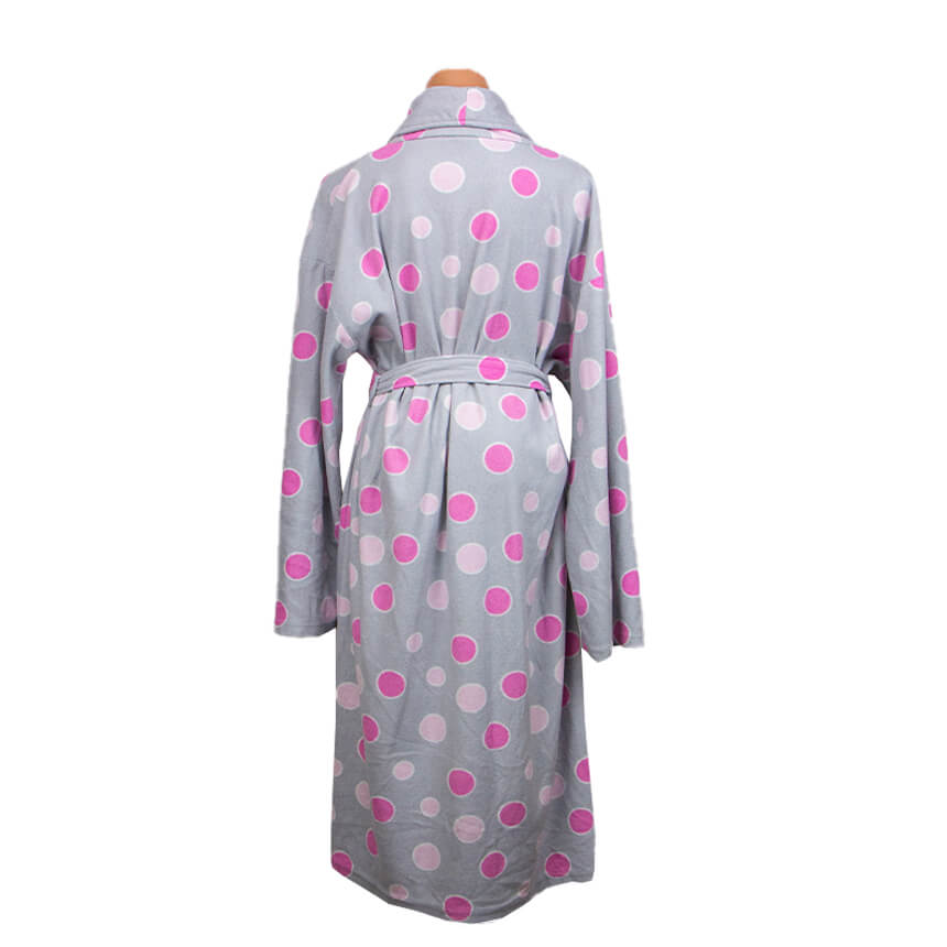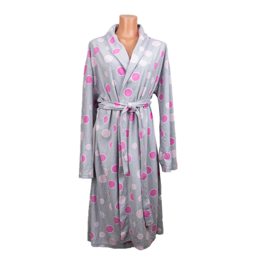 Халат серого цвета с крупными розовыми горохами разного оттенка.