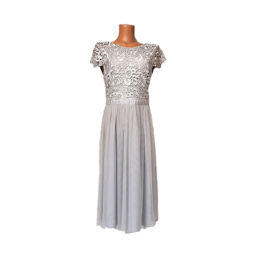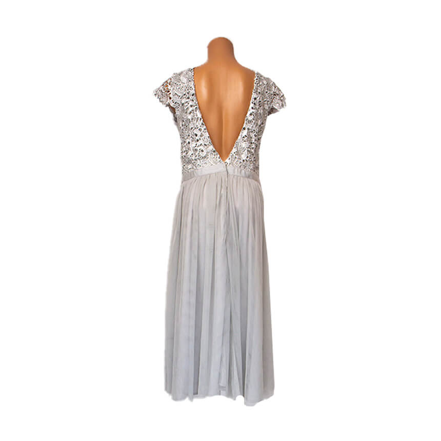 Платье нежного серого цвета до колена, отрезное по талии, с открытой спиной.