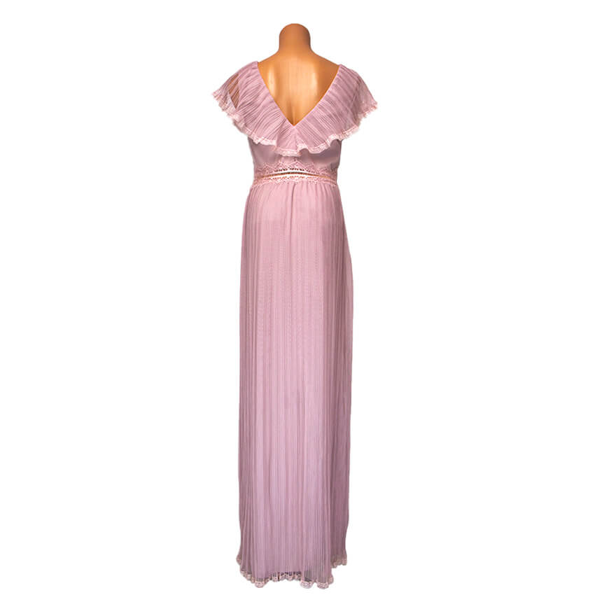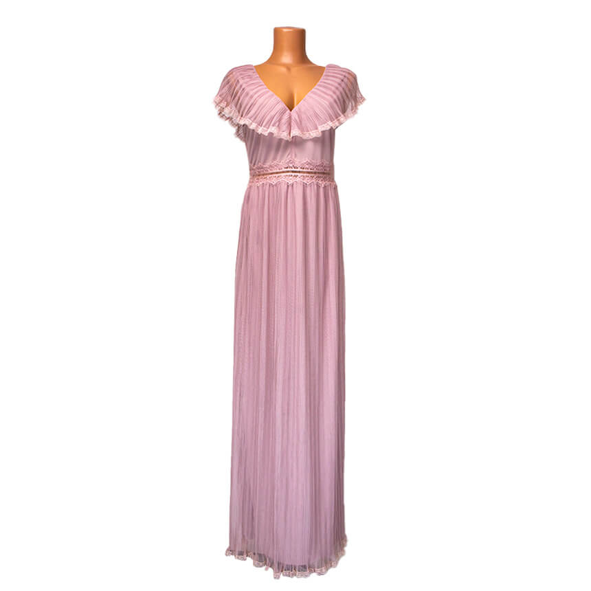 Платье пастельного пудрового цвета цвета, отрезное по талии, без рукавов.