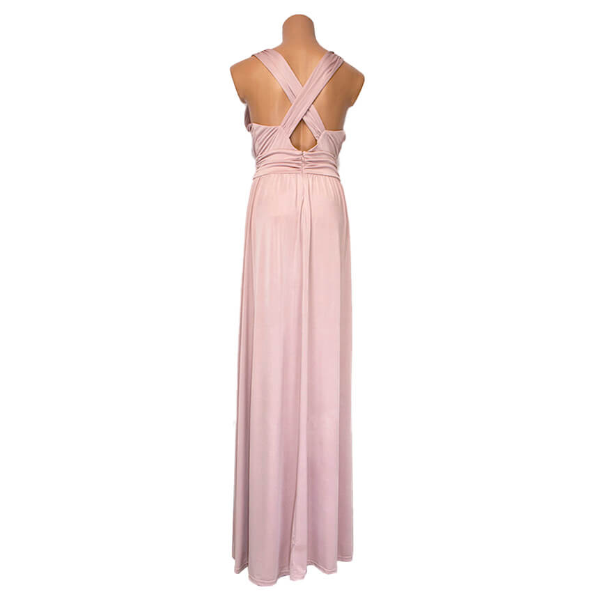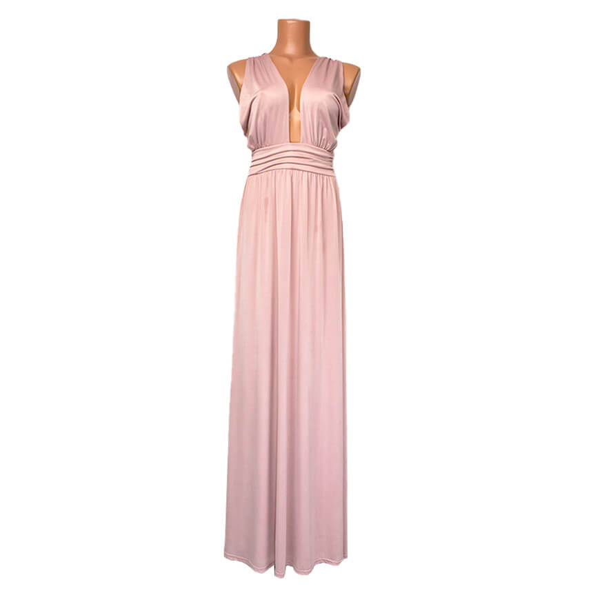 Платье нежного телесно-розового цвета, отрезное по талии на широком поясе. Глубокое декольте.