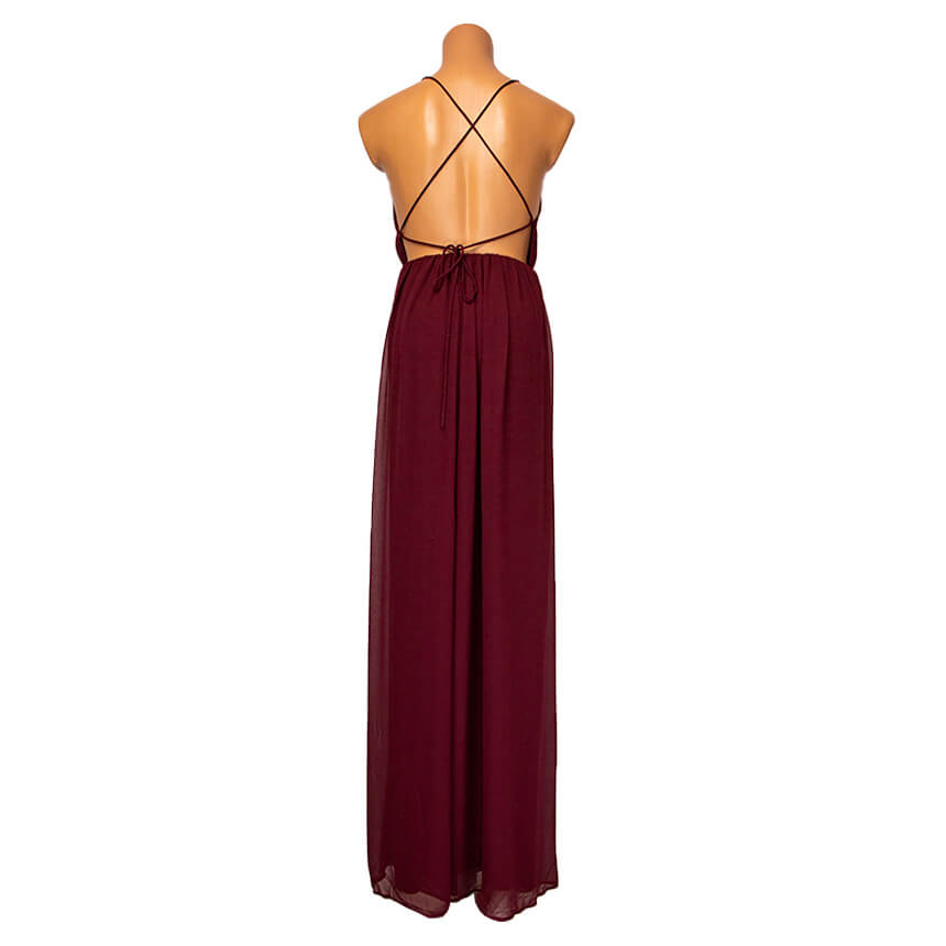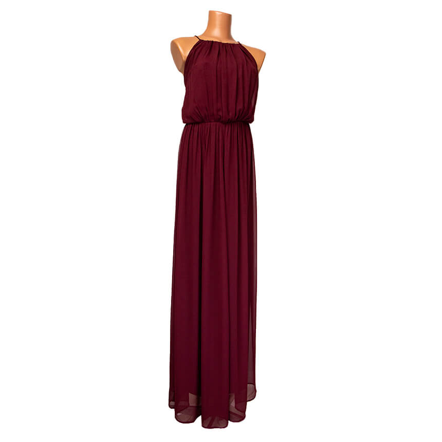 Платье насыщенного бордового цвета, отрезное по талии, с открытыми плечами и открытой спиной.