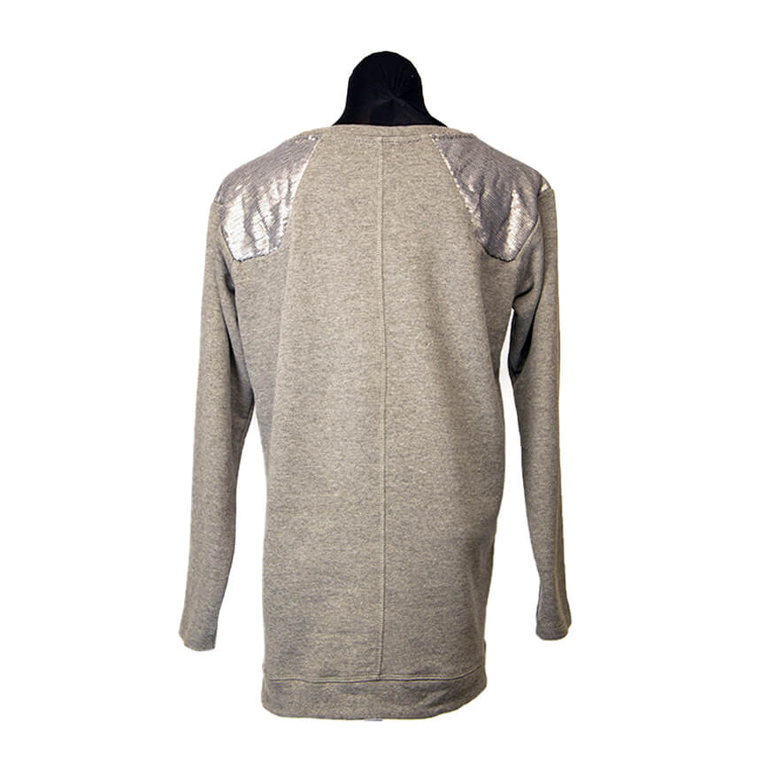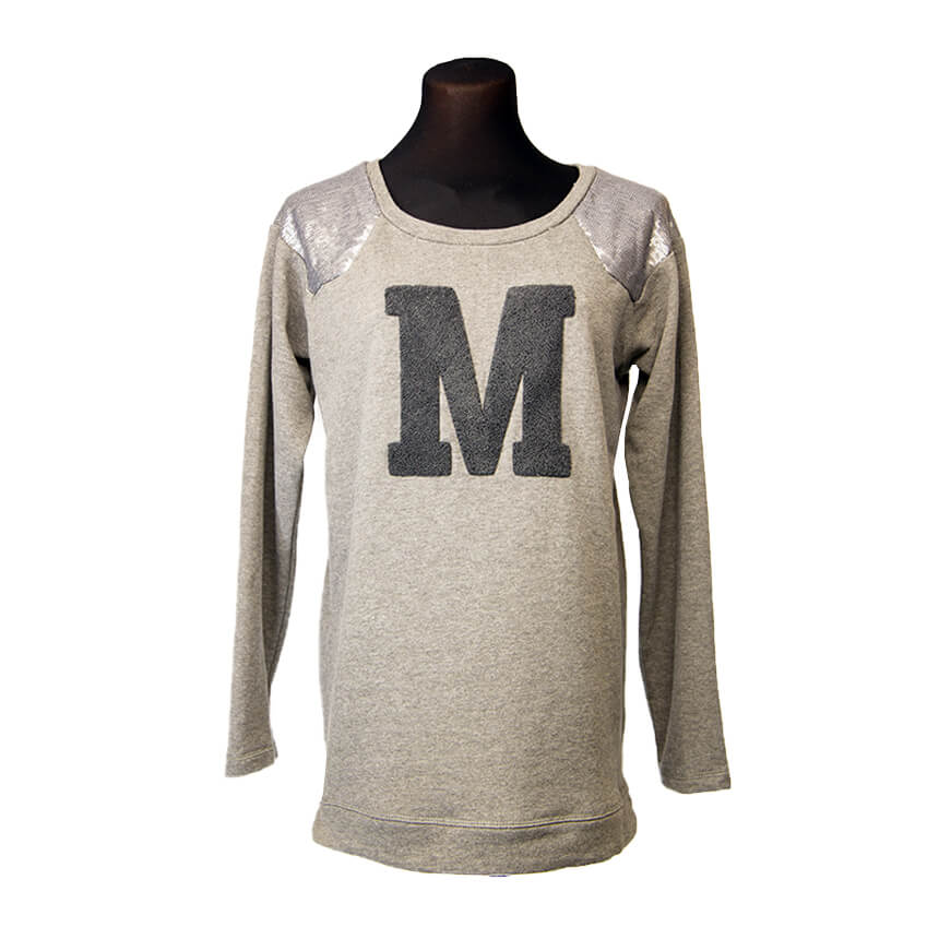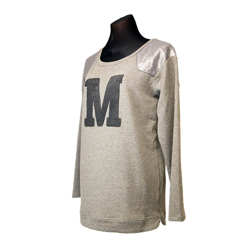Приятный серый цвет, на плечах украшение с люрексом. Свитшот с блестящим принтом - буква М. Отстрочка.
