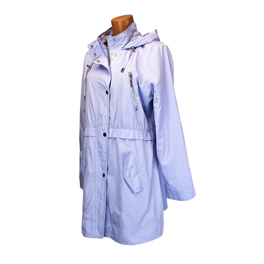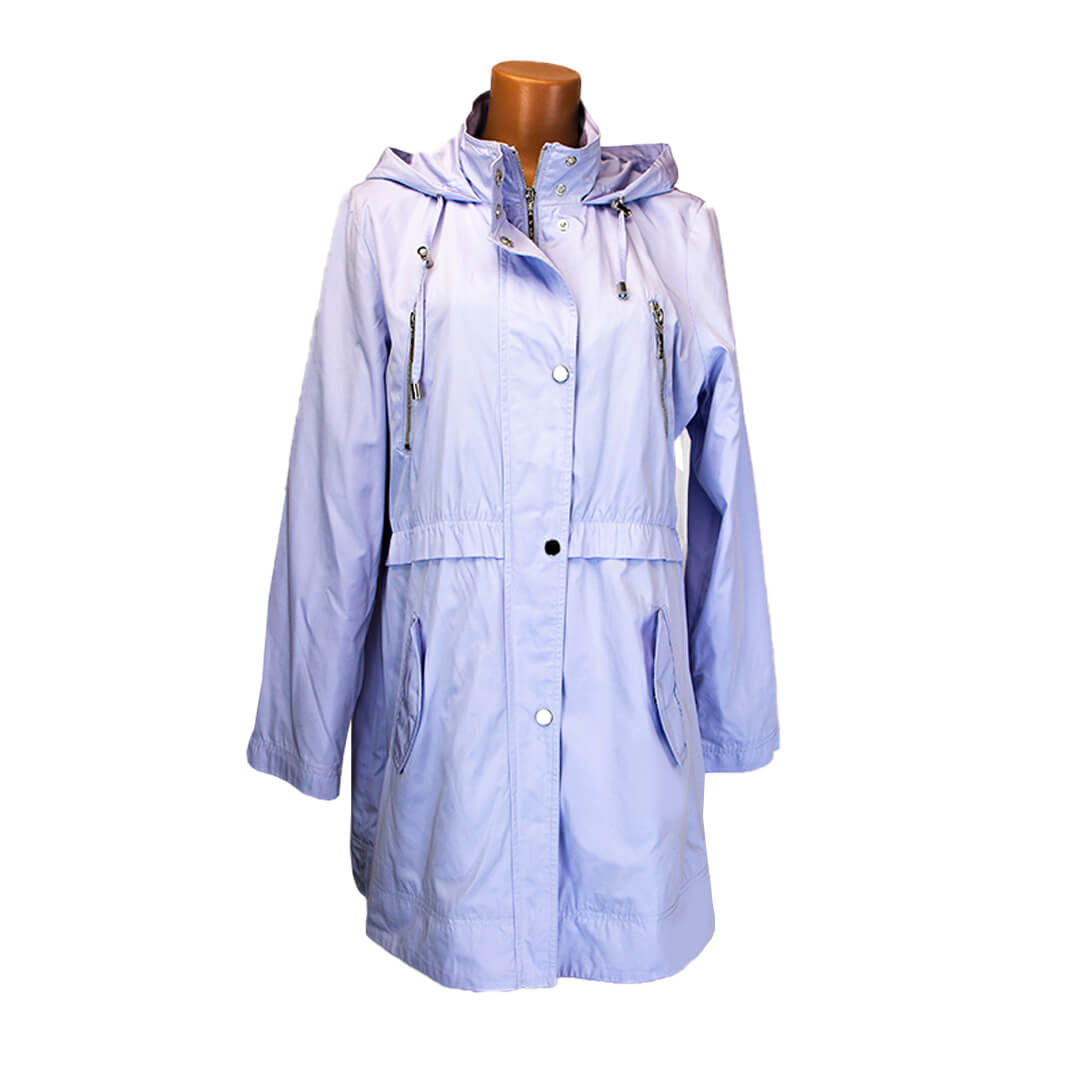 2 кармана на молнии, 2 на кнопках. По талии - резинка. Капюшон регулируется, внизу манжет.