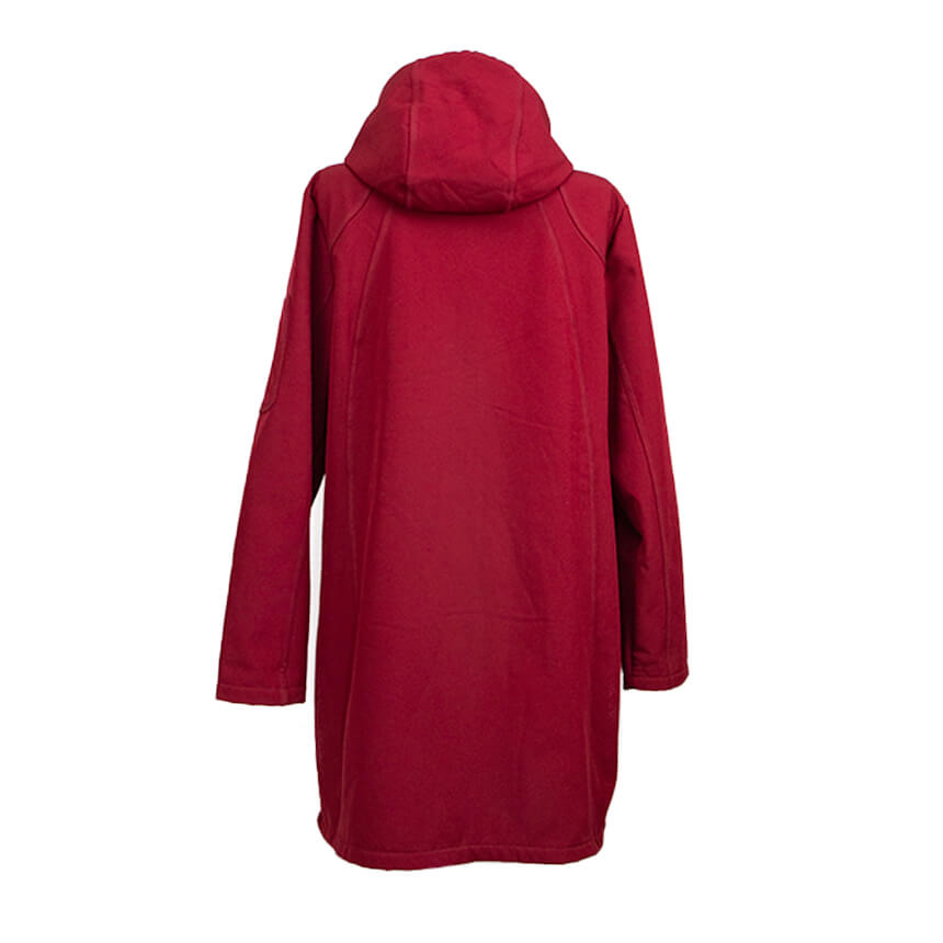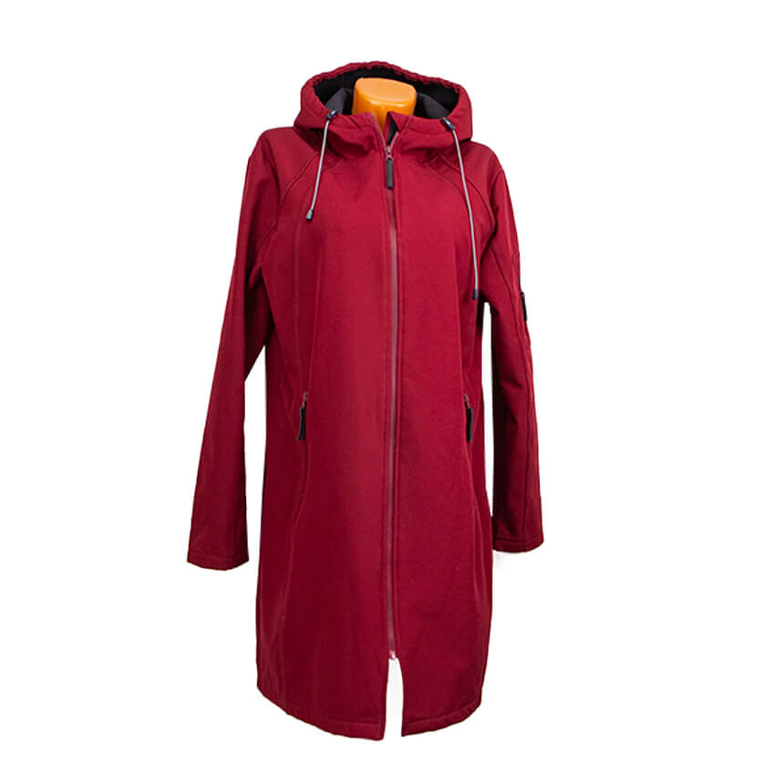 Удлиненная куртка бардового цвета с капюшоном.