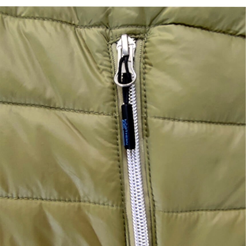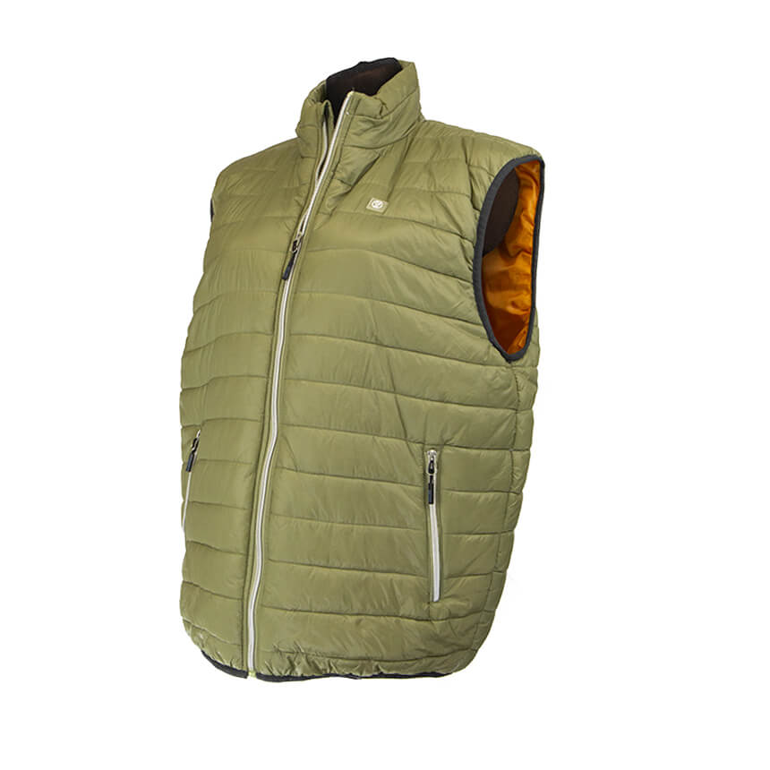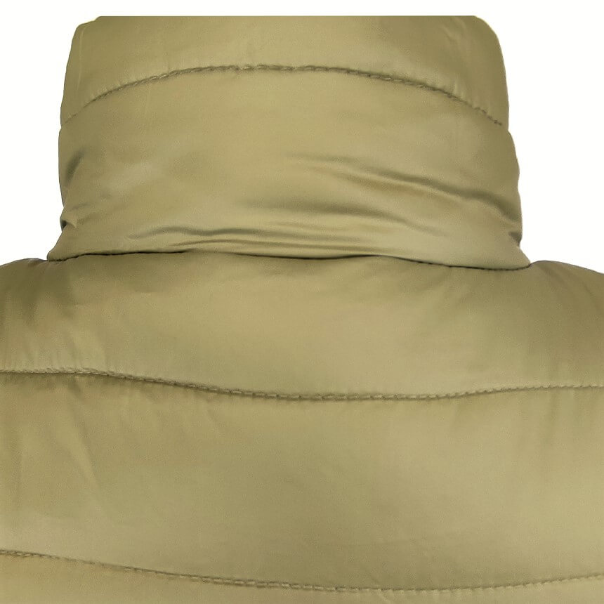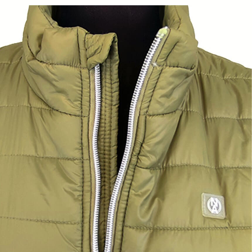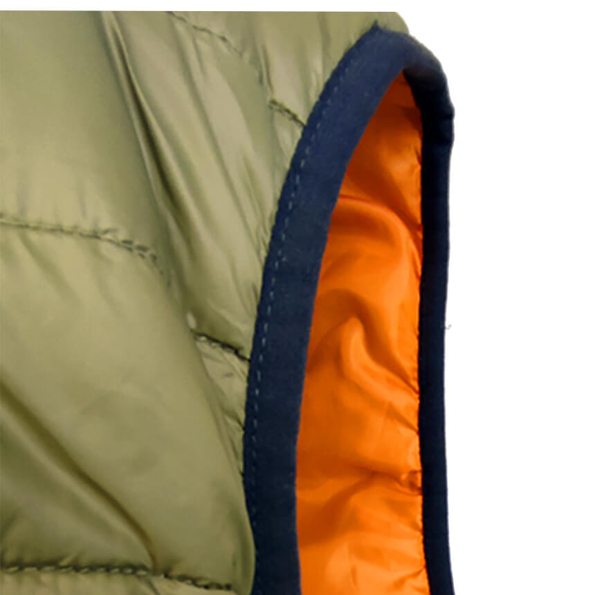 Стеганый жилет светло-зеленого цвета с оранжевой подкладкой.