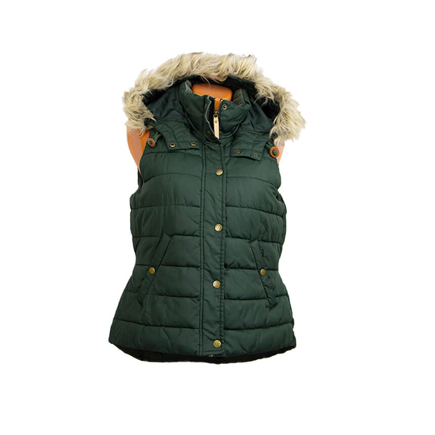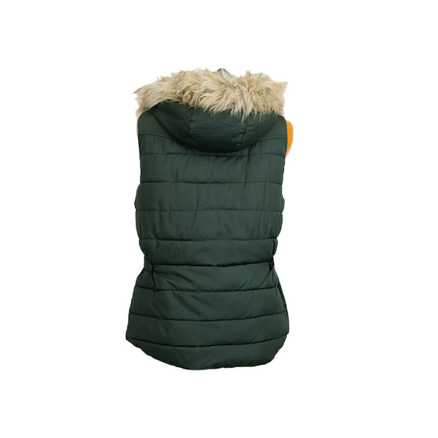 Жилет дутый зеленого цвета с капюшоном с коричневой опушкой.