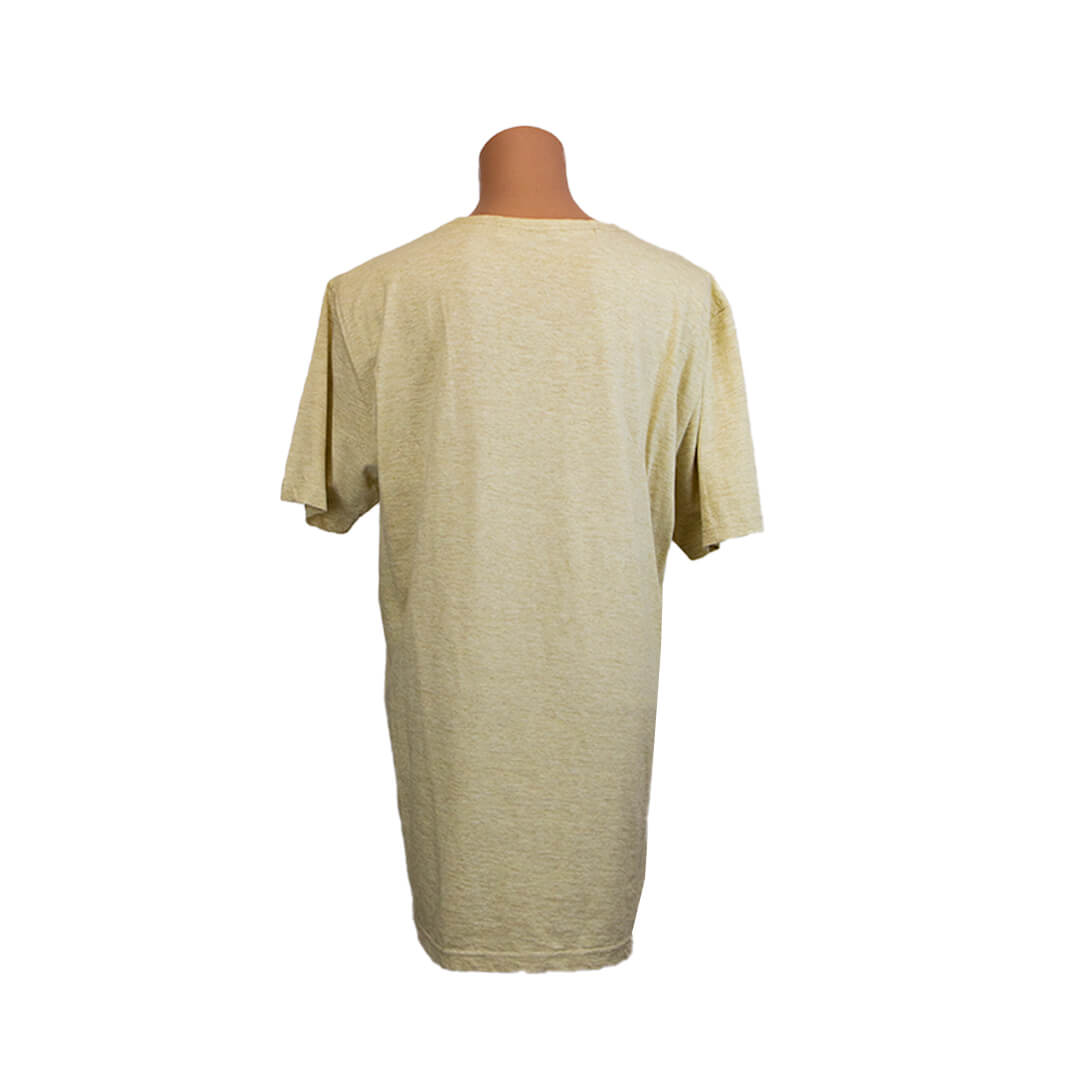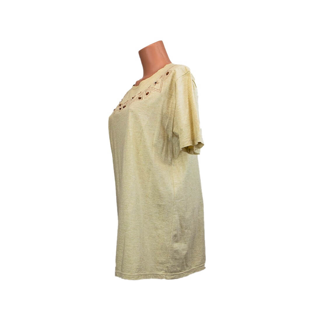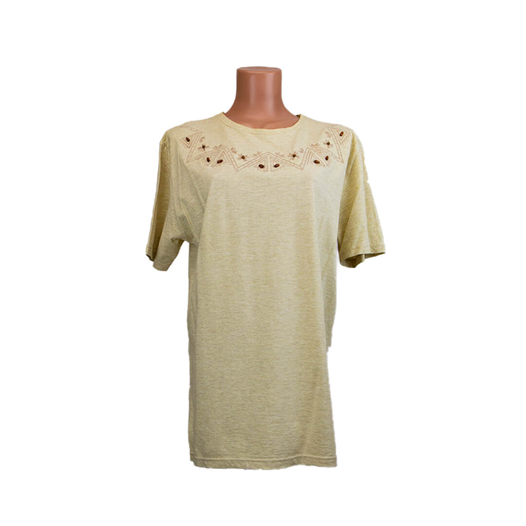 Круглый вырез. Вышивка по груди с деревянными бусинами.