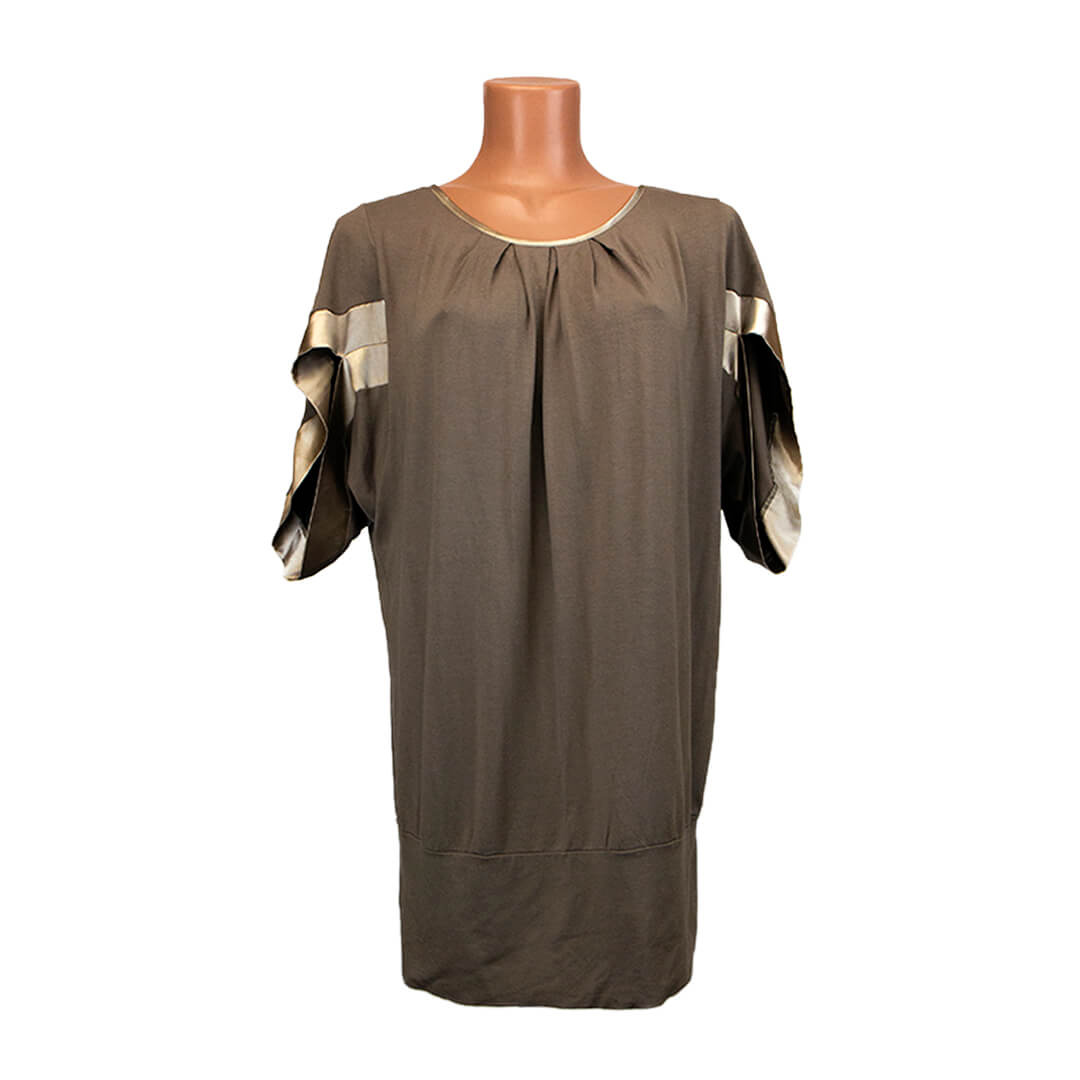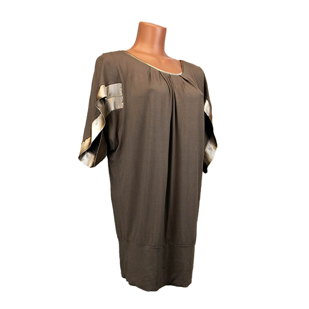 Глубокий круглый вырез спереди, Y-образный сзади. Отделка - атласный рулик. Широкий манжет по низу.